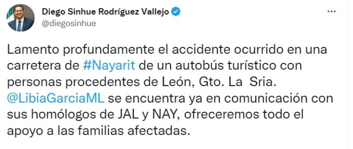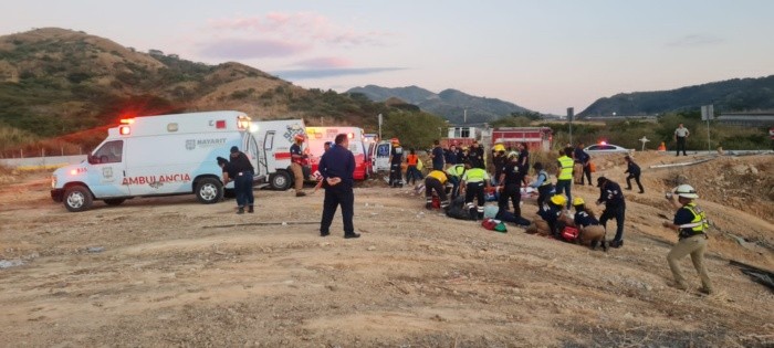 Debido a la volcadura de un camión de pasajeros que provenía de Ayala, Nayarit con destino a León, Guanajuato, 11 personas fallecieron, mientras 37 resultaron heridas, acorde a información de fuentes oficiales.En el autobús privado de pasajeros se trasladaban 48 personas; de los fallecidos cinco eran hombres, tres mujeres, dos menores de edad mujeres y un menor varón.Los lesionados fueron trasladados por personal de Ixtlán del Río y Compostela al Hospital de Tepic, Nayarit.Mientras que los occisos se encontraban a la espera de ser recogidos por personal de Ciencias Forenses y del Ministerio Público. En imágenes que circulan en redes se puede observar el camión de pasajeros deshecho, sin toldo y con los laterales abiertos; así como personas tiradas sobre el suelo, aplastadas entre las estructuras y otras ayudando a los atrapados. Después de las 22:00 horas, las autoridades correspondientes informaron que la cifra de fallecidos subió 14; sin embargo hasta el momento no se tienen detalles de quiénes son las víctimas. El gobernador de Guanajuato, Diego Sinhue, lamentó lo sucedido la tarde de este viernes y agregó que en coordinación de las autoridades apoyarán a todos los afectados.De igual manera, Libia García, secretaria de Gobierno de Guanajuato, mandó sus condolencias a través de un post publicado en cuenta de Twitter mencionando que se les brindará el apoyo a las personas heridas y a las familias de los fallecidos.MF
