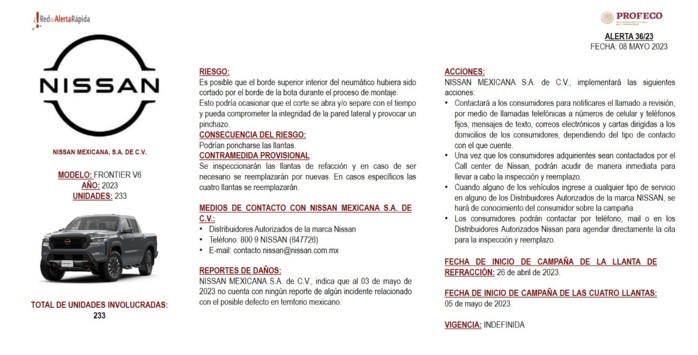 La Procuraduría Federal del Consumidor (Profeco) hizo un llamado a las personas que tienen un cierto modelo de camioneta Nissan debido a que presenta fallas en sus neumáticos que podrían desencadenar un accidente.Se trata de la Frontier V6, año 2003, que de acuerdo con el organismo, el riesgo se encuentra en que posiblemente el borde superior interior del neumático “hubiera sido cortado por el borde de la bota durante el proceso de montaje”.Lo anterior significa que, con el tiempo, el corte se abra y/o separe, comprometiendo la integridad de la pared lateral y termine ponchando las llantas, lo que aumentaría el riesgo de accidentes.De acuerdo con la Profeco, los vehículos contabilizados que pudieran presentar esta falla son 233 unidades hasta el momento.Si tuviste fallas en tu camioneta Nissan Frontier V6 no debes preocuparte, ya que la vigencia de las campañas y las revisiones son indefinidas, según se destaca en el informe de la Profeco.JM