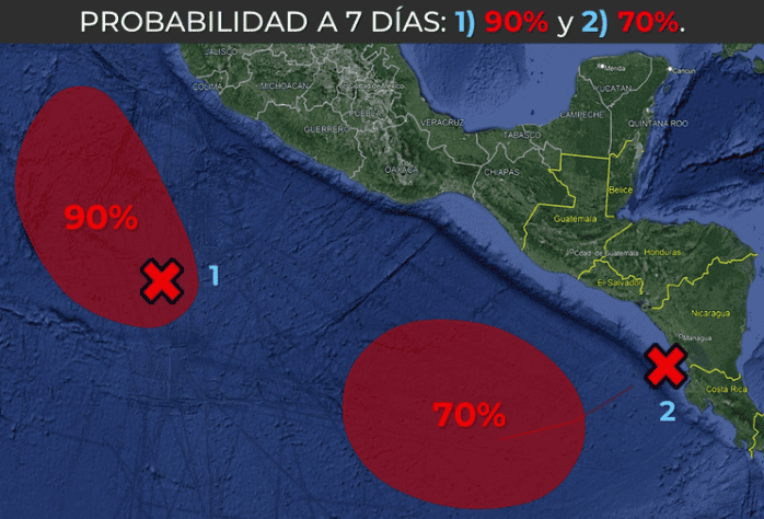México se encuentra rodeado de tres fenómenos naturales que tienen altas probabilidades de desarrollo ciclónico este martes 17 de octubre, según información del Servicio Meteorológico Nacional (SMN), fuente oficial del Gobierno de México en materia climática.El SMN informó de los dos primeros sistemas:1.- Zona de baja presión al sur de Jalisco, mantiene 90% de probabilidad para desarrollo ciclónico en 48 horas y en 7 días. Se localiza aproximadamente a 680 kilómetros al sur-suroeste de Punta San Telmo, Michoacán; y a 800 kilómetros al sur de Playa Pérula, Jalisco; y se desplaza lentamente hacia el oeste noroeste.2.- Zona de baja presión sobre la costa occidental de Nicaragua y el sureste de México, mantiene 10% de probabilidad para desarrollo ciclónico en 48 horas y 70% de probabilidad para desarrollo ciclónico en 7 días. Se localiza a 700 kilómetros al este-sureste de la desembocadura del Río Suchiate (frontera entre México y Guatemala).Pero también observa un tercero:3.- Zona de baja presión al este de las Islas de Barlovento, incrementa a 60% de probabilidad para desarrollo ciclónico en 48 horas y mantiene 80% en 7 días. Se localiza aproximadamente a 5 mil 010 kilómetros al este de las costas de Quintana Roo y se desplaza hacia el oeste.Hoy martes, la zona de baja presión con alta probabilidad de desarrollo ciclónico o posible ciclón tropical "Norma" se localizará al sur de las costas de Jalisco y Colima, sus desprendimientos nubosos incrementarán la probabilidad de lluvias fuertes a puntuales muy fuertes en el occidente y sur del país, siendo puntuales intensas en Jalisco (sur), Colima, Michoacán y Guerrero.Por su parte, se espera que a partir del miércoles el centro de baja presión con probabilidad de desarrollo ciclónico se localice al sur de las costas de Oaxaca, manteniéndose en estrecha vigilancia. A su vez, prevalecerá el escaso potencial de lluvias sobre estados del noroeste, norte y noreste de México. De continuar su evolución, se podría desarrollar un nuevo ciclón tropical que llevaría el nombre de "Otis".Así se ven los tres sistemas:* * * Mantente al día con las noticias, únete a nuestro canal de Whatsapp * * *Con información Servicio Meteorológico NacionalOA