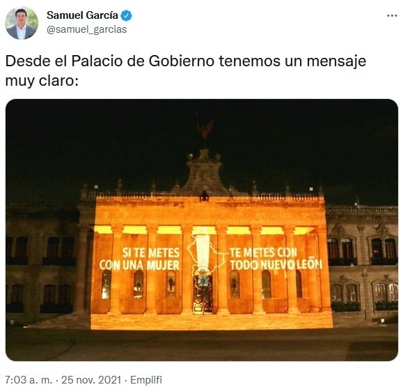 Samuel García Sepúlveda, gobernador de Nuevo León, levantó críticas en redes sociales luego de que publicara un mensaje donde advirtió: "Si te metes con una mujer, te metes con todo Nuevo León", en el marco del Día Internacional de la Eliminación de la Violencia contra las Mujeres; pero en respuesta recibió mensajes recordándole el momento cuando "humilló" a su esposa, Mariana Rodríguez, por "enseñar mucha pierna".Samuel García publicó una imagen del Palacio de Gobierno, donde el color natural de la cantera rosa, aparece sustituido por el naranja y la imagen con el siguiente texto: "Desde el Palacio de Gobierno tenemos un mensaje muy claro: Si te metes con una mujer, te metes con todo Nuevo León".El mandatario estatal desató reacciones inmediatas, la mayoría criticando su actuación al frente de la gubernatura, al considerar sus detractores que es "pura palabrería" y nada de acciones para enfrentar la violencia que afecta al estado en general y a las mujeres en particular.En otro spot donde asegura que habrá cero tolerancia a cualquier agresión en contra de mujeres y niñas, también le llovieron las críticas.El agosto de 2020 Samuel García recibió críticas en redes sociales por reprocharle a su esposa, Mariana Rodríguez, que durante un video en vivo "enseñaba mucha pierna".Rodríguez es influencer de moda y belleza, por lo que hace uso de las redes sociales de manera constante. Sin embargo, durante un video en el que portaba pijama, el entonces senador le pidió que subiera la cámara para que no mostrara las piernas, a lo que ella respondió que solo eran las rodillas."Me casé contigo pa' mí, no pa' que andes enseñando", le dice Samuel, a lo que ella contesta con un "perdón".Tras hacerse viral el video, Samuel García manifestó que fue una "broma machista" por lo que ofreció una disculpa a su esposa y a las mujeres."Las bromas machistas son una mala costumbre que tenemos muchos hombres y que nos tenemos que quitar. Ya me disculpé con Mariana y agradezco que me señalen este tipo de actitudes. No son correctas y tienen que parar", escribió en su cuenta de Twitter.OA