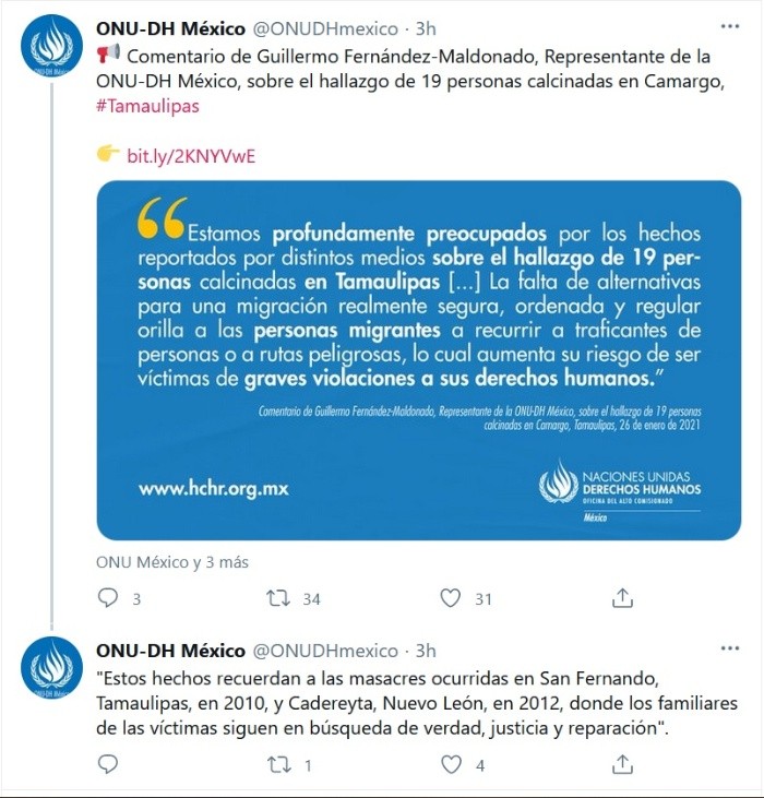 La Oficina en México de la Alta Comisionada de las Naciones Unidas para los Derechos Humanos (ONU-DH) dijo sentir preocupación por los 19 cuerpos calcinados que se encontraron la semana pasada en Tamaulipas y que podrían corresponder a personas de Guatemala.Guillermo Fernández-Maldonado, representante de la ONU-DH en México, comparó el hallazgo de los 19 cuerpos con las masacres de 2010 en San Fernando, Tamaulipas; y de 2012 en Cadereyta, Nuevo León, donde fueron asesinados 72 y 49 migrantes, respectivamente."Estamos profundamente preocupados por los hechos reportados por distintos medios sobre el hallazgo de 19 personas calcinadas en Tamaulipas. De acuerdo con la información recibida, al menos varias de las víctimas serían guatemaltecas"."La falta de alternativas para una migración realmente segura, ordenada y regular orilla a las personas migrantes a recurrir a traficantes de personas o a rutas peligrosas, lo cual aumenta su riesgo de ser víctimas de graves violaciones a sus derechos humanos", expresó el representante de la ONU-DH.Fernández-Maldonado hizo un llamado al Estado mexicano para que garantice la plena identificación de los restos encontrados con métodos científicos, además de que se permita a los familiares de las víctimas acceder a los expedientes judiciales que se abran por estos hechos."Este es un paso imprescindible para garantizar el derecho a la verdad, la justicia y la reparación de los familiares de las víctimas", señaló en un comunicado el representante de la ONU-DH.Recordó que aunque ya ha pasado una década de los hechos ocurridos en San Fernando y ocho años de los registrados en Cadereyta, los familiares de las víctimas siguen en búsqueda del acceso a la justicia, la reparación del daño y la verdad sobre estos acontecimientos.JM