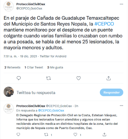 La caída de un puente colgante en la comunidad de Cañada de Guadalupe, en el municipio de Santa María Temaxcaltepec, en Oaxaca, ha dejado, por el momento, 25 personas lesionadas, sin embargo, no se reportan decesos, informó la coordinación estatal de Protección Civil del estado.Protección Civil detalló que la mayoría de los lesionados son adultos y menores, mismos que fueron atendidos o están recibiendo atención médica en hospitales de la zona.Varias familias de la zona del paraje de Cañada de Guadalupe Temaxcaltepec, zona chatina, iban a una posada en las últimas horas de la tarde del sábado, cuando cruzaron el puente colgante, señaló la coordinación en un comunicado.La Cepco señaló que mantienen un monitoreo del desplome y de las familias que resultaron lesionados tras la caída del mismo.En un primer momento, medios informativos locales señalaron que había al menos medio centenar de personas lesionadas; no obstante, en el reporte que Cepco publicó este domingo, el reporte preliminar es de 25 personas.Usuarios de redes sociales iniciaron desde la noche del sábado una colecta de víveres y dinero para las víctimas del incidente.GC