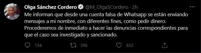 Olga Sánchez Cordero, titular de la Secretaría de Gobernación (Segob), denunció que fue creada una cuenta falsa de WhatsApp a su nombre, desde la que se solicita dinero a los contactos.En un mensaje en redes sociales, Sánchez Cordero advirtió que estos hechos se tienen que investigar por las autoridades correspondientes para sancionar a quién o quiénes resulten responsables."Me informan que desde una cuenta falsa de Whatsapp se están enviando mensajes a mi nombre, con diferentes fines, como pedir dinero”, explicó Cordero.Agregó que: "Procederemos de inmediato a hacer las denuncias correspondientes para que el caso sea investigado y sancionado".Aunque la secretaria de Gobernación no habla de hackeo, su denuncia se suma a la de otros políticos que han visto vulnerada la seguridad de sus teléfonos celulares y sus aplicaciones digitales.Recientemente, la senadora del Partido Revolucionario Institucional (PRI), Claudia Anaya, informó que su cuenta de WhatsApp fue hackeada para pedir dinero a sus contactos, además que Ricardo Monreal, senador de Morena, también denunció en días pasados la intervención de su teléfono.El exalcalde de Miguel Hidalgo, Víctor Hugo Romo, y el alcalde de Cuajimalpa, Adrián Rubalcava, también denunciaron que sus teléfonos celulares fueron hackeados, por lo que perdieron el control de sus cuentas.***Si te interesó esta noticia y quieres saber más, entonces descarga y descubre INFORMAPlus, la aplicación digital de EL INFORMADOR, en donde tenemos contenidos exclusivos, seleccionados por nuestros editores, para darles una experiencia más completa a los lectores.Descarga la aplicación y pruébala GRATIS por treinta días.Para iOS: https://apple.co/35jaVgbPara Android: https://bit.ly/3gwVSEVSi eres suscriptor de EL INFORMADOR tu acceso está incluido, solicítalo al 33 3678-7777AC