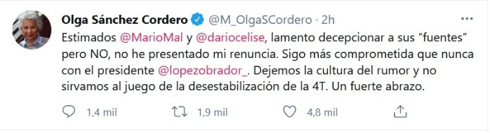 La titular de la Secretaría de Gobernación (Segob), Olga Sánchez Cordero, desmintió las versiones sobre su presunta renuncia al cargo.A través de las redes sociales, Sánchez Cordero aclaró que sigue "más comprometida que nunca" con el gobierno del Presidente Andrés Manuel López Obrador (AMLO).La responsable de la política interna del Gobierno federal hizo un llamado a dejar atrás la "cultura del rumor" y no servir al juego de la desestabilización de la Cuarta Transformación.Apenas ayer martes renunció Omar Cervantes Rodríguez, quien fungía como director general de Comunicación de la Segob, tras la filtración de un audio donde supuestamente el ahora exfuncionario pedía que se involucrara al consejero jurídico de la Presidencia de la República, Julio Scherer, y su familia, en el apoyo al candidato del PRI-PRD a la gubernatura de Nuevo León, Adrián de la Garza.JM