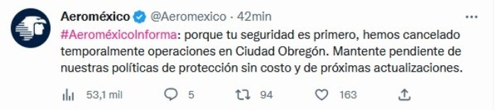 Debido a los hechos violentos en el norte del país como consecuencia de la detención de Ovidio Guzmán, hijo del narcotraficante "El Chapo" Guzmán, Aeroméxico canceló temporalmente sus operaciones en Ciudad Obregón, Sonora.En su cuenta de Twitter, @Aeromexico informó: "#AeroméxicoInforma: porque tu seguridad es primero, hemos cancelado temporalmente operaciones en Ciudad Obregón. Mantente pendiente de nuestras políticas de protección sin costo y de próximas actualizaciones".LEE: Pasajeros viven momentos de terror durante balacera en aeropuerto de CuliacánCabe recordar que el Aeropuerto Internacional de Culiacán se encuentra cerrado desde las 08:30 horas debido a la situación de violencia que se vive en la Entidad.JM