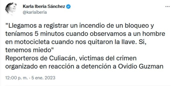 Durante los hechos violentos que se vivieron esta mañana en Culiacán, luego del operativo de detención de Ovidio Guzmán, un reportero fue víctima de violencia.Gilberto Meza, de la agencia de noticias Quadratín, fue despojado de una camioneta cuando cubría los bloqueos.El periodista narró en ForoTV que un grupo de hombres armados le quitaron la camioneta en la que viajaba junto con otro compañero, y le pidieron que se retirara del lugar."Hemos sido víctimas de un despojo de hombres armados. Estamos bien, mis compañeros reporteros y yo", narró Meza para el canal de noticias.En entrevista con la periodista Karla Iberia Sánchez, Meza aseguró que esto sucedió cuando estaban cubriendo uno de los bloqueos:“Teníamos ahí alrededor de cinco minutos cuando empezamos a observar gente que se acercaba en motocicleta, uno de ellos sacó un arma de fuego, amenazó a mi compañero, quien traía el vehículo, le quitó las llaves y se llevó la unidad”.El periodista narró que después del despojo, recorrieron las calles caminando y lograron observar a hombres con capuchas, armados con rifles de alto poder y circulando en camionetas sin logotipos oficiales.JM