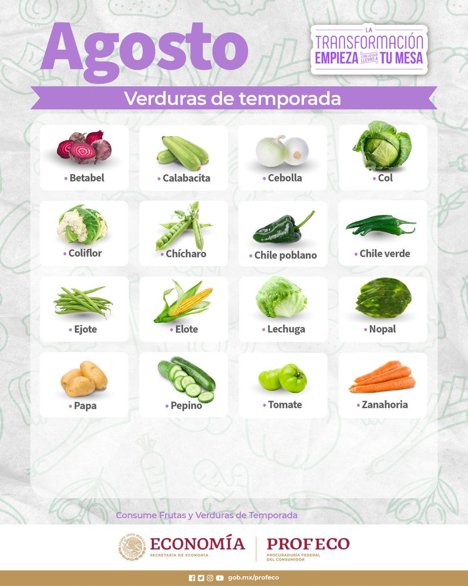 La Procuraduría Federal del Consumidor constantemente se encuentra emitiendo las recomendaciones directas que benefician a la salud y economía de todos los consumidores mexicanos. En sus distintas revistas dirigidas al público en general se realizan estudios de marcas de distintos productos en donde evalúan su calidad; pero, además de esto, también emiten comunicados en sus redes sociales para apoyar al día a día de todos. En esta ocasión, la Profeco ha dicho cuáles son las verduras que conviene comprar esta temporada.La Profeco ha revelado que durante esta temporada de verano de agosto. La Secretaría de Agricultura y Desarrollo Rural, los productos de temporada conservan sus aportes nutricionales a plenitud, además guardan textura, apariencia, frescura y sabor, por lo que son de mayor calidad en su época de recolección.Una de las razones principales por los que se recomienda consumir productos de temporada es porque éstos están frescos y conservan mejor sus propiedad nutricionales. Además, un extra es que se venden a un menor precio, y es que esto se debe a que hay una gran disponibilidad de estos en el mercado.Durante el mes de agosto encuentras frutas como pera, durazno, tuna, granada y limón. Entre las verduras encuentras el chile verde, zanahoria, cebolla, col y lechuga.De acuerdo con la Profeco, las siguientes verduras son las que encuentras más económicas en esta temporada de agosto: