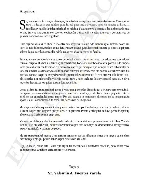 De nueva cuenta la empresaria Angélica Fuentes está envuelta en la polémica, ya que después de presentar su libro que lleva por nombre “Dos millones de huevos” en la Feria Internacional del Libro de Guadalajara (FIL), su padre, el señor Valentín Fuentes Varela, la acusó mentir y calumniar a su familia.“Hace algunos días leí tu libro. Y encontré con sorpresa una serie de mentiras y calumnias sobre mí. Pero, lo más doloroso, fue leer cómo denigras a tu mamá quien lamentablemente ya no está aquí para aclarar lo que escribes sobre ella y de lo más preciado que tenía: su familia”.“No creo que deba citar las innumerables infamias e imprecisiones que cuentas en este libro. Toda la familia, y yo en particular, estamos sorprendidos por este acto tuyo de desmesurado protagonismo, excesiva ambición y hambre de poder (…) Me preocupa tu salud mental y me abruma pensar en las dos niñas que tienes a tu cargo y que reciben este mal ejemplo que puede dañarlas por el resto de sus vidas”, dice un extracto de la carta.En este texto difundido en diversos medios de comunicación, el empresario Valentín Fuentes también se dijo sorprendido por haber sido señalado como machista por su hija, esto cuando asegura haberle cedido el control de sus empresas por 13 años.Fue en octubre pasado cuando Angélica Fuentes reapareció públicamente al informar a través de un video que litigará en tribunales la herencia de las dos hijas que tuvo con el empresario Jorge Vergara, quien en vida fuera propietario, entre otras empresas, del Club Deportivo Guadalajara.GC