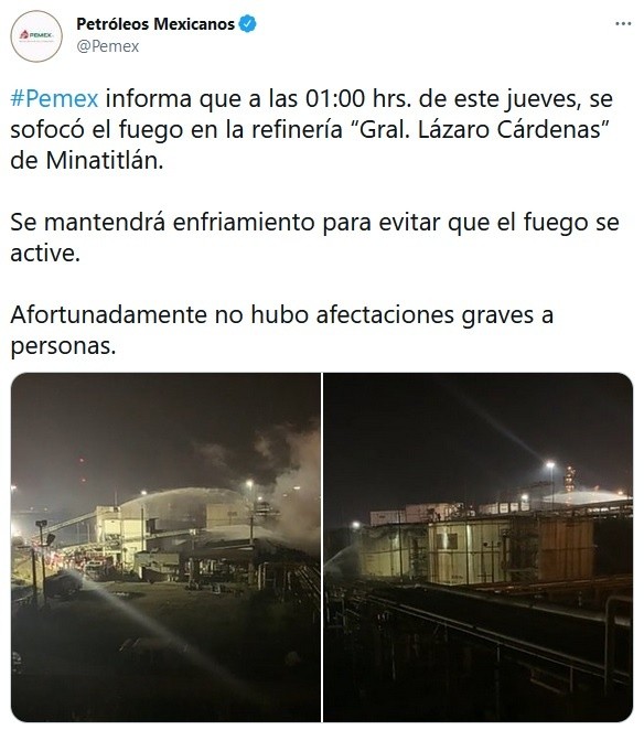 Pemex informó, a través de sus redes sociales, que a las 01:00 horas de este jueves se sofocó el fuego en la refinería "Gral. Lázaro Cárdenas" de Minatitlán.El aparatoso incendio en la refinería Lázaro Cárdenas de Minatitlán, en el sur de Veracruz, había dejado, hasta el último informe, ocho lesionados con heridas leves.Además, durante esta noche y parte de la madrugada, personal contra-incendios de Pemex y bomberos de diversas localidades mantuvieron trabajos para contener las llamas en la refinería.Afortunadamente no hubo afectaciones graves a personas.El incendio que ocurrió poco después de las 17:00 horas provocó quemaduras en dos trabajadores e intoxicación en otro de la empresa gubernamental Petróleos Mexicanos (Pemex), así como en cinco bomberos que participaban en controlar el incidente.De acuerdo con fuentes petroleras, la conflagración se inició en dos tanques de almacenamiento, uno de ellos de gasolina.OA