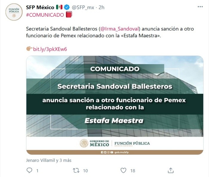 La Secretaría de la Función Pública (SFP) destituyó e inhabilitó este miércoles por diez años al funcionario de Petróleos Mexicanos (Pemex) Luis Manuel Galván Arcos por su relación con la "Estafa Maestra", una trama de corrupción en universidades públicas.Según la investigación, el inhabilitado, que estuvo a cargo de la Gerencia de Suministros y Servicios Administrativos en Regiones Marinas de Pemex, omitió incluir en su declaración patrimonial dos cuentas bancarias a nombre de su cónyuge por una cantidad de 3.2 millones de pesos."La declaración patrimonial es un instrumento fundamental para la rendición de cuentas", recordó la secretaria de la Función Pública, Irma Eréndira Sandoval, en el comunicado donde anunció la sanción.Los ejercicios en los Luis Manuel Galván ocultó su capital fueron 2013, 2014, 2014, 2015 y 2016.La Secretaría de la Función Pública reveló que tuvo una audiencia con el exfuncionario de Pemex en la que este "no pudo justificar por qué no reportó los instrumentos bancarios señalados"."Tenemos que construir una nueva ética pública, donde todos cumplamos con nuestras obligaciones y seamos parte de un México más honesto", consideró Sandoval, que en dos años en el cargo ha impuesto 43 inhabilitaciones y ocho destituciones.La "Estafa Maestra" fue un esquema de corrupción ocurrido bajo la administración del expresidente Enrique Peña Nieto (2012-2018) en el que se desviaron fondos por cinco mil millones de pesos a través de universidades públicas y empresas fantasma.JM