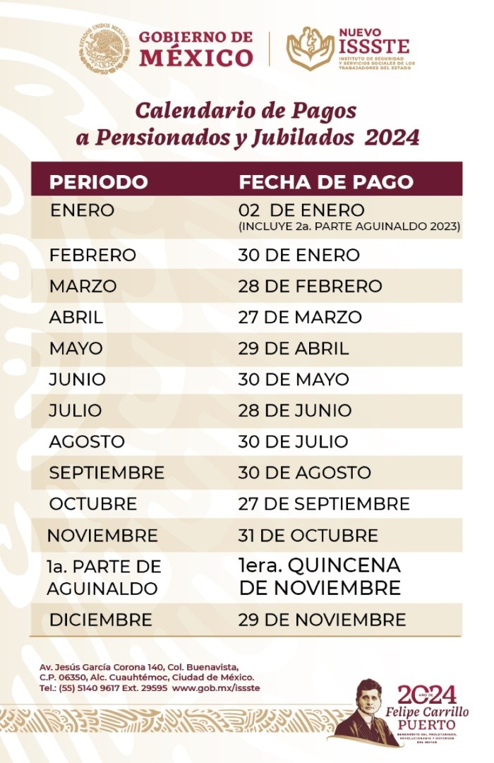 ¡Buenas noticias para los pensionados del Instituto de Seguridad y Servicios Sociales de los Trabajadores del Estado (ISSSTE)! El pago correspondiente al mes de septiembre está por caer. Es importante recordar que el ISSSTE efectúa el depósito unos días antes del mes previo a la fecha correspondiente. Es decir; el pago de febrero se realiza en enero, el de marzo en febrero, etc., esto con el propósito de que los pensionados tengan con anticipación su dinero para el mes entrante.De acuerdo con el calendario oficial de Pagos a Pensionados y Jubilados 2024 del ISSSTE, el depósito correspondiente al mes de septiembre caerá mañana, viernes 30 de agosto.De modo que los beneficiarios de esta pensión podrán acudir a la sucursal bancaria de su agrado para poder retirar el efectivo del mes de septiembre. Quedarían cuatro pagos en lo que queda del año:FS