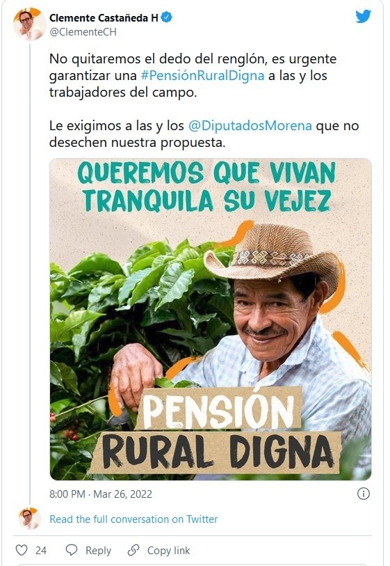 Legisladores de Movimiento Ciudadano en el Senado de la República y en los Congresos locales de Jalisco, Nayarit, Aguascalientes, Veracruz, Baja California y San Luis Potosí, lanzaron un exhorto a los diputados de Morena para que aprueben iniciativa que garantiza una pensión rural digna a los trabajadores del campo; denuncian que la bancada morenista planea rechazar esta propuesta en San Lázaro.“Volvemos a tener la oportunidad de cumplir y hacer justicia para las y los campesinos, pero resulta que las y los diputados de Morena quieren desechar esta propuesta. Imagínense nada más qué injusto es trabajar toda una vida de sol a sol, la mayoría de las veces con salarios injustos, y llegar a la tercera edad sin un retiro digno”, dijo Clemente Castañeda, coordinador del Grupo Parlamentario de Movimiento Ciudadano en el Senado de la República.El partido naranja remarca que, desde hace cinco años, está impulsando una iniciativa que garantice un retiro digno para los trabajadores del campo mexicano; detallan que, como diputado federal en la LXIII Legislatura, Castañeda presentó la iniciativa #PensiónRuralDigna, pero fue rechazada; posteriormente, en la LXIV Legislatura, el diputado federal Eduardo Ron la volvió a impulsar, pero también se votó en contra.Advierten que de nuevo la bancada naranja presentó la iniciativa en la actual Legislatura, la cual será sometida a votación en las Comisiones Unidas de Seguridad Social y de Desarrollo y Conservación Rural, Agrícola y Autosuficiencia Alimentaria.“Lamentablemente, las y los diputados federales están citados a sesión de las Comisiones Unidas sólo para rechazar la iniciativa que Movimiento Ciudadano presentó para garantizar una pensión rural digna a los 16 millones de campesinas y campesinos”, denunció Castañeda.“Desde la Bancada Naranja del Senado y de los congresos locales de seis estados exigimos lo justo: que se garantice de una vez por todas una pensión digna para las y los trabajadores del sector rural”, puntualizó el senador Clemente Castañada.JM