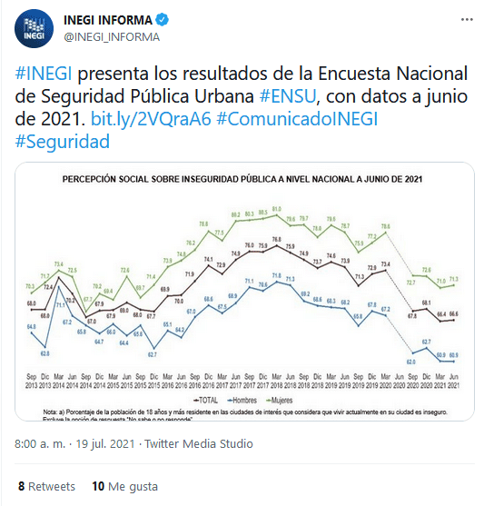 La percepción de inseguridad de los mexicanos aumentó del 66.4% en marzo al 66.6% en junio, según la encuesta trimestral divulgada este lunes por el Instituto Nacional de Estadística y Geografía (Inegi).Esto significa que el 66.6% de la población de 18 años y más percibe que vivir en su ciudad es inseguro, un alza de 0.2 puntos porcentuales frente al resultado de hace tres meses, indicaron los resultados de la Encuesta Nacional de Seguridad Pública Urbana."Este porcentaje representa un cambio estadísticamente significativo con respecto del registrado en diciembre de 2020, que fue de 68.1 por ciento. Sin embargo, no representa un cambio estadísticamente significativo con respecto de marzo de 2021, que fue de 66.4 por ciento", apuntó el Inegi en el comunicado.En el segundo trimestre del año, la percepción de inseguridad continuó siendo mayor en el caso de las mujeres con 71.3%, mientras que en hombres fue del 60.9 por ciento.En lo referente a la percepción de inseguridad en espacios físicos específicos, en junio de 2021, el 77.6% de la población manifestó sentirse insegura en los cajeros automáticos localizados en la vía pública, 71.4% en el transporte público, 63% en el banco y 59.6% en las calles que habitualmente usa.Durante el segundo trimestre de 2021, el porcentaje de la población que mencionó haber visto o escuchado conductas delictivas o antisociales en los alrededores de su vivienda fue de: consumo de alcohol en las calles (61.9%), robos o asaltos (53.6%), vandalismo en las viviendas o negocios (415 por ciento).En ese mismo periodo también se identificaron venta o consumo de drogas (38.4 %), disparos frecuentes con armas (38.2 %), bandas violentas o pandillerismo (26,6 %), tomas irregulares de luz (14.8 %) y robo o venta ilegal de gasolina o diésel (huachicol) (3.3 por ciento).Las ciudades con mayor porcentaje de personas de 18 años y más que consideraron que vivir en su ciudad es inseguro fueron: Fresnillo (96.2 %), Cancún (88.7 %), Ecatepec de Morelos (87.7 %), Coatzacoalcos (86.9 %), Naucalpan de Juárez (86.7 %) y Tonalá (86.1 por ciento).Por otro lado, las ciudades con menor percepción de inseguridad fueron: San Pedro Garza García (7.1 %), Tampico (24.4 %), Los Cabos (25.4 %), San Nicolás de los Garza (25.9 %), Mérida (26.3 %) y Piedras Negras (28.8 por ciento).México ha registrado los años más violentos de su historia en los primeros dos años del Presidente Andrés Manuel López Obrador (AMLO), con 34.681 víctimas de asesinato en 2019 y 34 mil 554 en 2020.Además, reportó dos mil 963 homicidios en mayo, el mes más violento en lo que va de 2021.GC