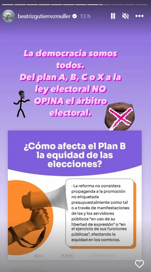 "La democracia somos todos. Del plan A, B, C o X a la ley electoral NO OPINA el árbitro electoral", dijo la escritora en sus historias de Instagram al desmentir la información que el INE ha difundido sobre el tema."Plan B contempla que el INE comparta con partidos políticos información reservada", refirió el organismo electoral en sus redes, a lo que Gutiérrez Müller lo calificó como falso y contestó: "¡Caramba! ¿Y cuántas veces el INE ha vendido el padrón electoral?". "¿En qué país el árbitro electoral hace campaña contra la ley electoral?", preguntó.En días pasados, en otro mensaje por el plan B de la reforma electoral, Gutiérrez Müller expuso los "dramas" del Instituto Nacional Electoral. En sus redes sociales, la esposa de López Obrador criticó al "árbitro electoral" por opinar de la ley electoral, porque el INE publicó cómo afectaría el plan B de la reforma electoral. "Órale, el árbitro electoral opinando de la ley electoral…", escribió en sus historias de Instagram.Por el "drama 2" del INE, la escritora cuestionó: "¿No se supone que el INE aplica la ley y se reserva a opinar sobre ella?".El INE publicó una imagen en la que advierte que por el plan B "será materialmente imposible garantizar tu derecho al voto libre y secreto", a lo que la esposa de López Obrador cuestionó en el "drama 3": "¿No se supone que los árbitros deben ser mudos?".En el "drama parte 4", Beatriz Gutiérrez Müller señaló: "con recursos públicos el árbitro electoral se opone a la ley que debe aplicar?".La investigadora reafirmó "Yo también soy INE" y "como soy mexicana mayor de edad, también a mí me corresponde contribuir a la democracia". "El INE no es de un grupo. Es una institución pública que recibe recursos públicos que pagamos todos", escribió. SL