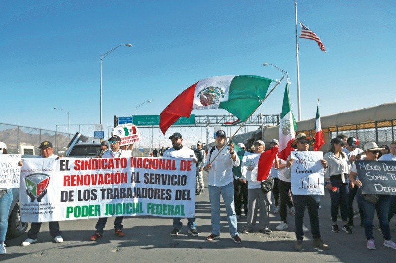 Decenas de manifestantes impidieron el paso en el Puente Internacional Córdova-Américas, también conocido como Puente Libre, en la frontera entre Ciudad Juárez, Estado de Chihuahua, y El Paso, Texas, Estados Unidos, en protesta contra la reforma judicial, para la elección de juzgadores por voto popular.