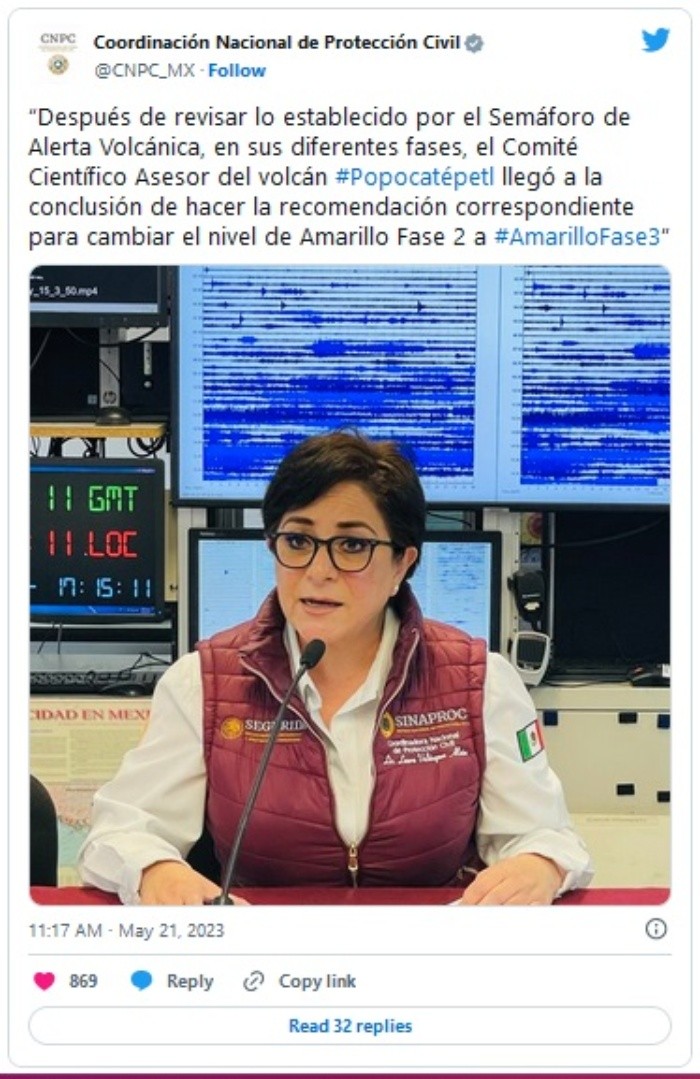 La Coordinación Nacional de Protección Civil informó esta mañana que el semáforo de alerta por el volcán Popocatépetl pasa a amarillo fase 3.En conferencia de prensa, Laura Velázquez Alzúa indicó que se deben tomar las medidas necesarias ante esta contingencia.El ingeniero Óscar Zepeda Ramos señaló que "al momento, estamos en alerta, en semáforo amarillo fase 3 [...] en este momento hay un incremento; sin embargo, no es un incremento tan alto que implicara ni una movilización ni una evacuación en este momento".De acuerdo con el Centro Nacional de Prevención de Desastres, los escenarios previstos para esta fase son:Durante esta fase se emiten las siguientes recomendaciones:También se sugiere realizar acciones preventivas para esta fase como:JM
