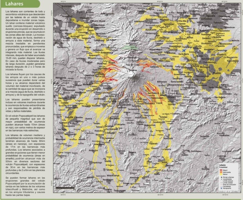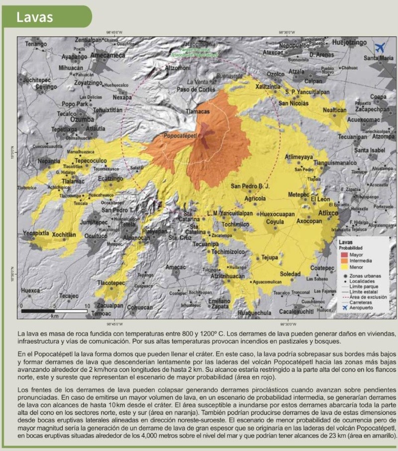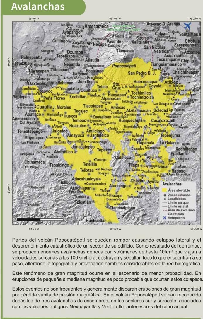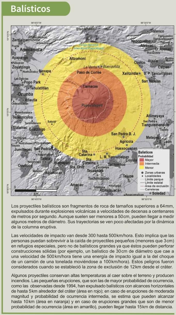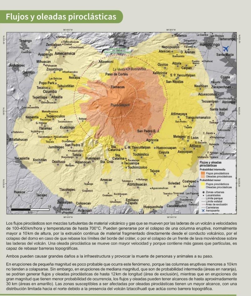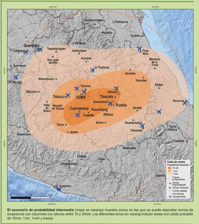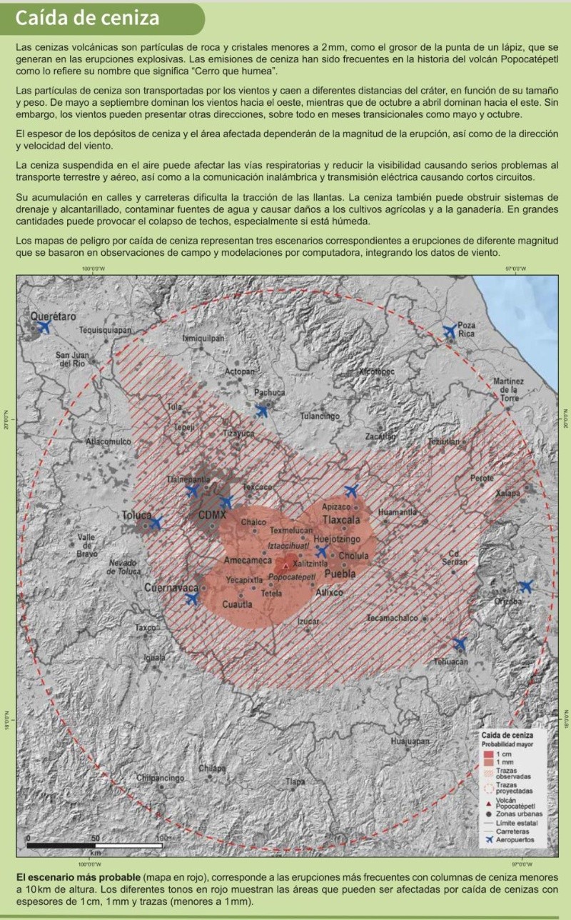 Esta mañana el Aeropuerto Internacional de la Ciudad de México (AICM) cerró, desde las 04:25 horas de este sábado 20 de mayo 2023, sus operaciones debido a "presencia de ceniza volcánica", proveniente del volcán Popocatépetl, que la víspera registró actividad.La alerta volcánica por el Popocatépetl se encuentra en fase 2 y el semáforo, en amarillo. Ese color indica que la población debe permanecer atenta y prepararse ante una posible evacuación, según el Centro Nacional de Prevención de Desastres (CENAPRED).El Cenapred y la Universidad Nacional Autónoma de México (UNAM) realizan un monitoreo diario sobre la actividad del volcán. Ambos organismos recomiendan a la población realizar las siguientes acciones ante la caída de ceniza:El volcán Popocatépetl se encuentra situado en los límites territoriales de Morelos, Puebla, Estado de México y cercano a Tlaxcala y la Ciudad de México, que conforman el llamado Valle de México, la zona poblacional más habitada del país. Tan sólo en la CDMX viven 9 millones 209 mil 944 de mexicanos, mientras que en el Estado de México, 16 millones 992 mil 418, según el Instituto Nacional de Estadística y Geografía (Inegi).La Secretaría de la Defensa Nacional (Sedena) publicó en el 2019 un plan Operaciones volcán Popocatépetl para cuando "se incremente y se determine la evacuación de las poblaciones de las áreas de riesgo, a fin de preservar a las personas, sus bienes y el entorno".Como parte de este plan del Ejército, el Comité Científico Asesor de dicho volcán considera tres áreas de peligro, partiendo como eje central el cráter del volcán:En un radio de 15 kilómetros "zona de alto riesgo". Comprende 16 municipios en el estado de Puebla, 6 en el estado de Morelos y 8 en el estado de México.En un radio de 30-60 kilómetros "zona de riesgo medio". Comprende 22 municipios en el estado de Puebla, 9 en el estado de Morelos, 6 en el estado de México y 18 en el estado de Tlaxcala.En un radio mayor de 60-90 kilómetros "zona de bajo riesgo". Comprende el resto de las poblaciones cercanas al volcán en los estados mencionados, en los que se incluyen el Estado de México y la Ciudad de México."Considerándose evacuar, en caso de erupción del volcán, 30 Municipios en la zona de alto riesgo y 56 en la de riesgo medio, calculándose que la población que se encuentra expuesta es de 3 millones 562 mil 596 personas; de las cuales 685 mil 776 se localizan en la zona de alto riesgo", señala el plan del Ejército ante una posible emergencia por el volcán Popocatépetl.Ante una posible erupción del volcán Popocatépetl, la Cenapred y la UNAM elaboraron mapas de peligros. Estos son:OF