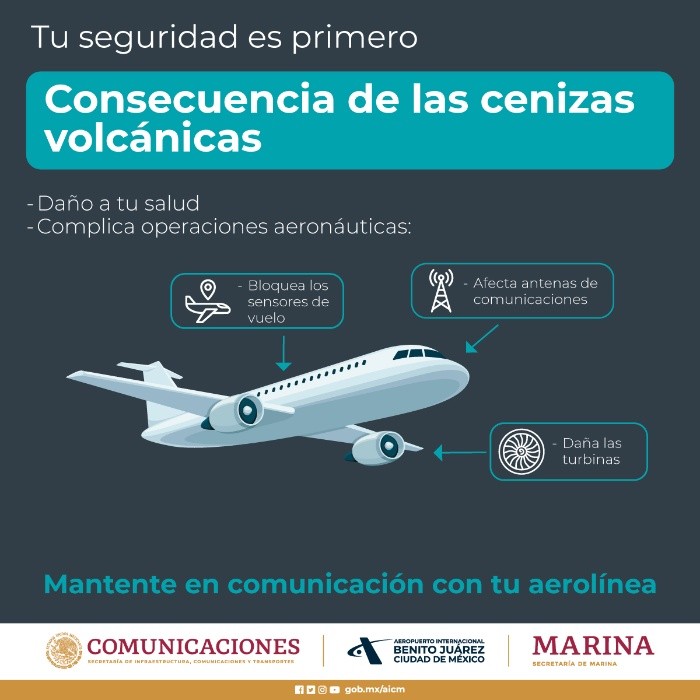 Luego de que el Gobierno de la Ciudad de México informara que, ante el cambio a la Fase 3 del Semáforo Amarillo de la Alerta Volcánica por la actividad del Popocatépetl, el riesgo para la capital es la caída de ceniza, se prevé que puedan cancelarse más vuelos.Aeropuerto Internacional de la Ciudad de México (AICM) dio a conocer por medio de redes sociales que "ante presencia de cenizas volcánicas las operaciones pueden suspenderse eventualmente".Detalló que volar en esas condiciones podría ocasionar afectaciones a avión que no le permitiría el viaje.El AICM publicó que algunas de las consecuencias de viajar mientras cae ceniza volcánica estarían, además de los daños a la salud, las complicaciones aeronáuticas como: Bloquear los controles de vuelo, afectar antenas de comunicaciones y dañar las turbinas.Explicó en sus redes sociales que "en vuelo o en tierra la ceniza sería absorbida por las turbinas", "afectaría equipos de logística", "obstruiría pistas" y "dañaría a personal operativo en tierra".