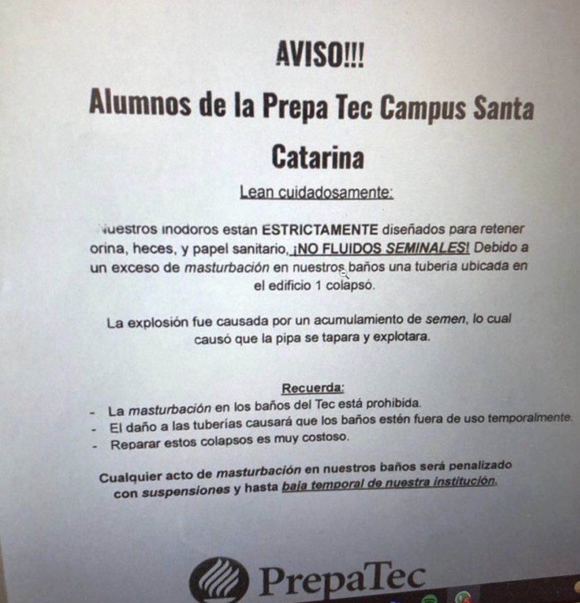 Un mensaje que alerta del cierre temporal de las instalaciones sanitarias de la Preparatoria Tec Campus Santa Catarina en Nuevo León se volvió viral hace unos días en las redes sociales, pues se asegura que la medida respondió a los daños a la infraestructura ocasionados por el exceso de “fluidos seminales”.“AVISO!!! Alumnos de la Prepa Tec Campus Santa Catarina. Lean cuidadosamente: Nuestros inodoros están ESTRICTAMENTE diseñados para retener orina, heces, y papel sanitario, ¡NO FLUIDOS SEMINALES! Debido a un exceso de masturbación en nuestros baños una tubería ubicada en el edificio 1 colapsó" (sic), se lee en el mensaje que supuestamente fue colocado en los baños. "La explosión fue causada por un acumulamiento de semen, lo cual causó que la pipa se tapara y explotara", continúa.La imagen compartida en Twitter desde la cuenta "Out of Context Monterrey" (@MtyOutOfContext) corresponde a la de una pantalla de computadora y según algunos usuarios, las instalaciones de dicho plantel educativo sí se mantuvieron cerradas, pero aseguran que dicho aviso no es real.Se trataría de un mensaje de broma que algún miembro de la comunidad estudiantil realizó para explicar las razones por las que los baños se mantuvieron fuera de funcionamiento."Contexto: En Tec Santa Catarina cerraron los baños y algún chistoso imprimió de esos posters y los colocó en los baños para que parezcan reales, pero según lo que yo sé, no son oficiales", explicó en Twitter el usuario @Shinonome530.El mensaje que circuló en redes sociales hace un llamado a los estudiantes a recordar que "la masturbación en los baños del Tec está prohibida" y que el daño a las tuberías causará que los baños estén fuera de uso temporalmente.Rápidamente otros estudiantes del plantel se sumaron a la conversación, asegurando que efectivamente alguien había impreso dichos avisos y que se trataba de una broma que algunos internautas ya estaban tomándose en serio. Por su parte, la institución educativa no ha emitido su postura con respecto a esta situación o si habría alguna sanción para quien haya ideado dicha broma.