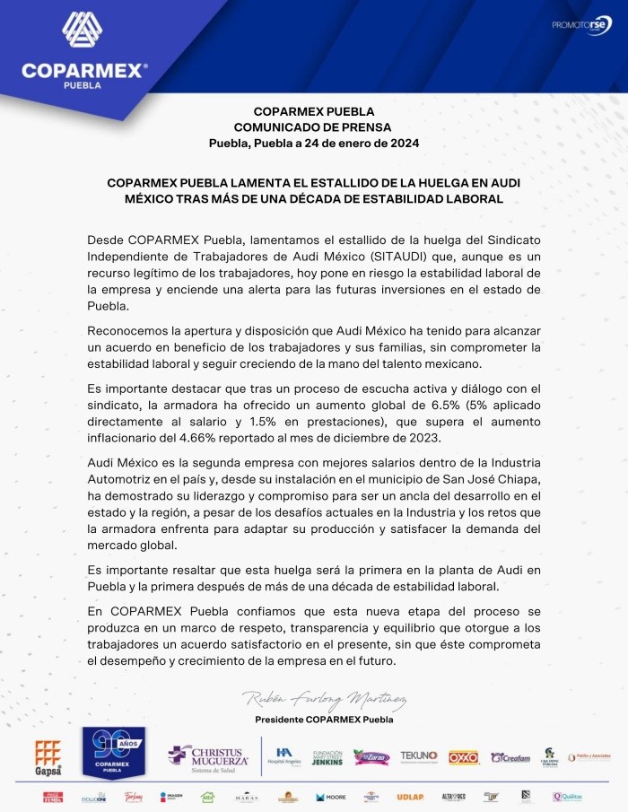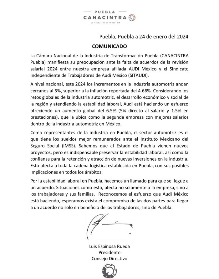 Los trabajadores sindicalizados de la planta armadora de Audi en San José Chiapa en el estado de Puebla, iniciaron una huelga este miércoles, debido a que no llegaron a un acuerdo sobre el aumento salarial de este 2024.El Sindicato Independiente de Trabajadores de Audi (SitAudi) pidió a la empresa alemana, un incremento salarial del 15.5 por ciento, del cual 10% era para el salario y 5.5 para las prestaciones.Sin embargo, Audi ofrecía un 6.5 por ciento, del cual, 5% iba directo al salario y 1.5% a las prestaciones. De acuerdo con el sindicato las negociaciones por el tema duraron varias semanas, incluso se involucró la Secretaría del Trabajo, pero no se logró ningún acuerdo.Por lo anterior, los trabajadores colocaron banderas rojinegras alrededor de las 11.00 horas a las afueras de la empresa. Además, a través de un comunicado el sindicado informó que realizaran roles de guardia para vigilar las puertas de la planta.Por su parte, la Cámara Nacional de la Industria de la Transformación (Canacintra) manifestó su postura ante la falta de acuerdos y advirtió que dicha helga podría afectar no solo a la empresa, sino a las familias y para toda la cadena logística instalada en Puebla.De acuerdo con Canacintra, a nivel nacional los aumentos salariales del sector automotriz de este 2024 están cercanos al 5%, superior a la inflación reportada del 4.66%.Mientras que, Coparmex Puebla lamentó el estallido de la huelga, aunque reconoció que es un recurso legítimo de los trabajadores, mencionó que “pone en riesgo la estabilidad laboral de la empresa y enciende una alerta para las futuras inversiones en el estado”.NA