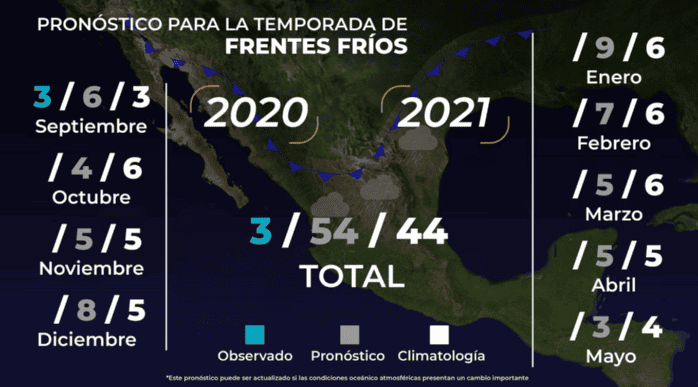 Para la temporada otoño-invierno se prevé el ingreso de 54 frentes fríos a México, 10 más que el promedio de 44, informó hoy la Comisión Nacional del Agua (Conagua).Tan solo en la primera quincena de septiembre ya se registraron 3 frentes fríos y para la segunda quincena del mes se esperan entre 2 y 3, dijo el coordinador general del Servicio Meteorológico Nacional (SMN), Jorge Zavala Hidalgo.La temporada de estos fenómenos comienza en septiembre y termina en mayo, detalló, aunque también pueden desarrollarse algunos fuera de estos meses.Estos sistemas están acompañada de tormentas invernales, que se registran principalmente durante los últimos meses del año y el inicio del siguiente.El fenómeno de los ríos atmosféricos también es recurrente, el cual provoca el ingreso de gran cantidad de nubosidad desde la zona del Océano Pacífico y, en consecuencia, lluvias de intensas a torrenciales.La Conagua informó que actualmente se desarrolla una zona de baja presión en el suroeste del Golfo de México, cuya probabilidad de desarrollarse a ciclón es de 90% en el pronóstico a 48 horas.Su ubicación es de unos 195 kilómetros al este-noreste de Tuxpan, Veracruz, con desplazamiento lento hacia el norte. En los próximos días, el fenómeno favorecerá nublados y lluvias de intensas a torrenciales en zonas de Chiapas, Hidalgo, Nuevo León, Oaxaca, Puebla, Querétaro, San Luis Potosí, Tabasco, Tamaulipas y Veracruz, así como vientos con rachas muy fuertes y oleaje elevado en costas del Golfo de México.IM