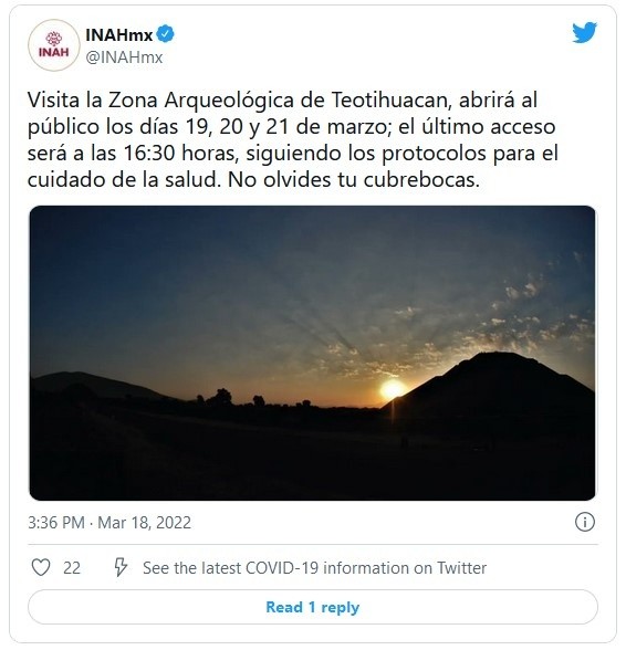 Aunque la Secretaría de Cultura y el Instituto Nacional de Antropología e Historia (INAH) había informado que por tercer año consecutivo permanecería cerrada la Zona Arqueológica de Teotihuacan, este viernes informaron que sí estará abierta durante el equinoccio de primavera 2022.El pasado 11 de marzo informó que el 19, 20 y 21 de marzo sólo estarían abiertas 137 zonas arqueológicas en 30 estados, entre las que no figuraba Teotihuacan; sin embargo, esta tarde el INAH dio a conocer que ese sitio arqueológico ubicado en el Estado de México sí estará abierto."La Secretaría de Cultura federal, a través del Instituto Nacional de Antropología e Historia (INAH), informa que la Zona Arqueológica de Teotihuacan, en el Estado de México, estará abierta al público los días 19, 20 y 21 de marzo, en un horario de 7:00 a 17:00 horas; el cierre de taquillas y último acceso a las personas será hasta las 16:30 horas", dijeron ambas instituciones en un comunicado conjunto.Detallaron que el sábado 19 estarán en funcionamiento las cinco puertas; en tanto que el domingo 20 y lunes 21 sólo abrirán las puertas 1, 2, 3 y 5: "Con esta apertura, suman 138 las zonas arqueológicas que, a lo largo y ancho del país, estarán dispuestas a la visita pública para este equinoccio, y que son una muestra de la diversidad y riqueza cultural y patrimonial de México".Indicaron que el acceso a las zonas arqueológicas se hará la aplicación de alcohol en gel y toma de temperatura, así como la revisión del uso obligatorio y adecuado del cubrebocas; se pedirá mantener la sana distancia de 1.50 metros entre visitantes durante todo el recorrido."Asimismo, se invita a las y los visitantes a cuidar de su salud con los implementos adicionales que considere, y abstenerse de ir si presenta síntomas, está enfermo o convive con personas en riesgo. Es muy importante que el público recuerde que aún continuamos con una epidemia activa, por lo cual es de suma importancia respetar los lineamientos sanitarios y atender las recomendaciones y señalamientos que el personal del INAH indique durante la estancia en estos espacios culturales, que son para disfrute de la sociedad", señalaron.JM