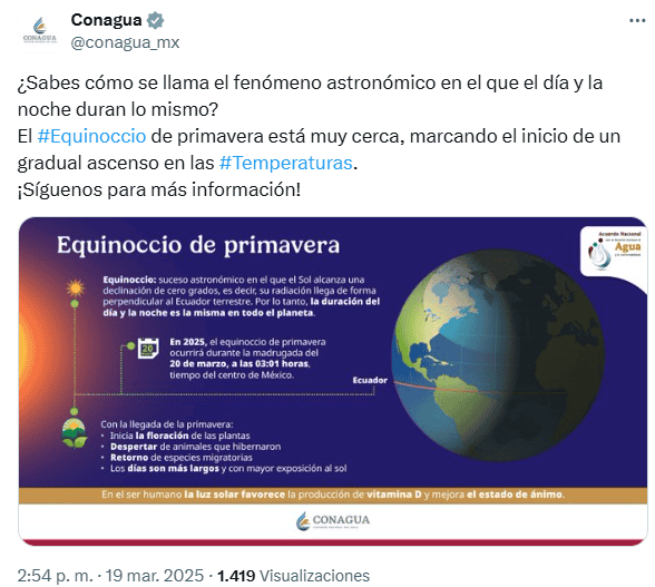 Este jueves 20 de marzo a las 03:01 horas tiempo del centro de México tuvo lugar el equinoccio de primavera, la estación del año que trae condiciones de clima más caluroso en el país, y el florecimiento de las plantas y árboles en el hemisferio norte.El equinoccio de primavera, como se le conoce a la estación astronómica, marca el momento en el que el día y la noche tienen la misma duración, después de que en invierno los periodos de luz solar fueran menores en comparación con los de oscuridad.Aunque la fecha popular en la que se dice que inicia la primavera es el 21 de marzo, el momento exacto corresponde a ese en el que el eje de la Tierra y su órbita se alinean de tal manera que ambos hemisferios reciben una cantidad igual de luz solar.Este año, el equinoccio de primavera durará 92 días y 17 horas, para dar paso al solsticio de verano el viernes 20 de junio.La llegada de la estación del año ha desatado todo tipo de reacciones en redes sociales; usuarios que gustan de este periodo de temperaturas más altas no han dejado pasar la oportunidad de festejar, mientras que aquellos que no lo disfrutan han comenzado a quejarse debido a las condiciones del clima venideras.También está en un punto medio todo aquel que solo comparte memes para sumarse a la tendencia en Internet.*Mantente al día con las noticias, únete a nuestro canal de WhatsAppOF