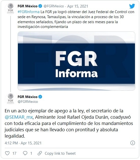 Un juez vinculó a proceso a 30 agentes de la Secretaría de Marina (Semar) relacionados con cuatro desapariciones forzadas en Nuevo Laredo, Tamaulipas, informó este jueves la Fiscalía General de la República (FGR)."La FGR ya logró obtener del Juez Federal de Control con sede en Reynosa, Tamaulipas, la vinculación a proceso de los 30 elementos señalados, fijando un plazo de seis meses para la investigación complementaria", indicó el organismo autónomo en un comunicado.Los procesados están relacionados con "una serie de confrontaciones violentas" ocurridas en el sexenio anterior, de las que "resultaron diversas denuncias por desaparición forzada", detalló la FGR.En su conferencia de prensa mañanera, el Presidente Andrés Manuel López Obrador (AMLO) confirmó que las detenciones, consumadas el 9 de abril están relacionadas con la desaparición de cuatro personas en Nuevo Laredo en "un hecho que se presenta en el Gobierno anterior"."Es un asunto que se heredó, y la instrucción es que no se tolera la violación de derechos humanos, cero impunidad, trátese de quien se trate. Entonces, se está atendiendo esta decisión", aseguró AMLO.López Obrador presumió la colaboración de las Fuerzas Armadas en la captura de los sospechosos, algo que reiteró la FGR."En un acto ejemplar de apego a la ley, el secretario de la Semar, almirante José Rafael Ojeda Durán, coadyuvó con toda eficacia para el cumplimiento de los mandamientos judiciales que se han llevado con prontitud y absoluta legalidad", aseveró la Fiscalía.JM