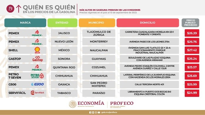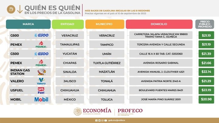 Este domingo la la Procuraduría Federal del Consumidor (Profeco) dio a conocer en su sección “#QuiénesQuién” de sus redes sociales, la lista de las gasolineras de México que cuentan con los precios más bajos, esto con la finalidad de ayudar a los ciudadanos puedan aprovechar de estos precios.Según la Profeco, el precio promedio de la gasolina premium es de aproximadamente $24.67 por litro, mientras que la gasolina regular se sitúa en alrededor de $22.59 por litro. En la Zona Metropolitana de Guadalajara existen varias gasolineras para llenar el tanque de tu auto, pero te diremos cuál es la estación de servicio que ofrece la gasolina regular de menor costo.La Profeco nos indica que la gasolinera Valero que se encuentra en el municipio de Tonalá es la que vende la gasolina regular más barata, la cual está ubicada en Avenida Patria Norte 2140-A con un precio de 21.29 pesos, mientras que la más cara es de la misma empresa Valero que se encuentra en el km 7.5 carretera Fed. 80 Guadalajara- Zapotlanejo en un precio de 23.99. Por otro lado, la gasolina premium más cara se encuentra en Tlajomulco de Zúñiga en la gasolinera Pemex ubicada en la carretera Morelia-Guadalajara KM 20-1 poniente y oriente con un precio de 26.39 pesos. MF