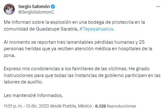 La noche de ayer miércoles 13 de diciembre se registró la explosión de una bodega de almacenamiento de pirotecnia, que era utilizada para las fiestas patronales en la comunidad de Guadalupe Sarabia, perteneciente al municipio de Tepeyahualco, Puebla.La explosión de pirotecnia dejó un saldo de 3 muertos y 25 heridos, de los cuales 23 fueron trasladados a los hospitales cercanos del municipio, confirmó el gobierno del estado de Puebla.Elementos regionales de la Coordinación General de Protección Civil Estatal, servicios médicos y ambulancias de Libres, Zaragoza, Perote y Cruz Roja, brindaron asistencia a las víctimas.El gobernador Sergio Salomón expresó sus condolencias a las familias de las víctimas en sus redes oficiales. En Internet también circula un video del momento exacto en que se registra el incidente. En la grabación se observa a varios hombres manipulando un torito en la plaza principal cuando de pronto se registra la explosión, aparentemente, porque se acercaron a la zona donde se almacenaban los fuegos artificiales.*Mantente al día con las noticias, únete a nuestro canal de WhatsAppOF