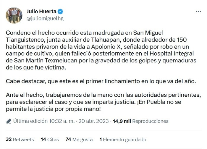 Un hombre que ingresó a un campo de cultivo a robar unos brócolis porque tenía hambre fue linchado por una turba iracunda de más de 150 personas en hechos ocurridos en el Estado de Puebla. Autoridades condenaron el homicidio comunitario y prometieron tomar acciones al respecto.La víctima, identificada como Apolonio “N”, murió tras haber ser linchado por habitantes de la comunidad de San Miguel Tianguistenco en Tlahuapan. Los pobladores lo acusaron de haberse robado un par de brócolis tras ingresar a una huerta.La Fiscalía de Puebla detalló que, aunque Apolonio fue llevado con vida a un hospital, el equipo médico no logró salvar su vida debido a los múltiples golpes y quemaduras que Apolonio recibió.La Fiscalía estatal detalló en un comunicado que la víctima de linchamiento era una persona humilde, y por la necesidad se introdujo a los campos de cultivos para tomar un par de brócolis.De acuerdo con la información preliminar, los pobladores privaron de la libertad al joven, después lo golpearon y finalmente le rociaron gasolina y le prendieron fuego. Elementos de la Policía Estatal intervinieron y trasladaron a Apolonio al hospital de San Martín Texmelucan, donde murió.El fiscal estatal, Gilberto Higuera Bernal, aseguró que esto es algo que no se puede dejar pasar, y “estamos trabajando en esto y vamos a proceder contra quienes cometieron este salvaje hecho”.De acuerdo con un estudio de la Universidad Iberoamericana, en Puebla se han cometido 78 linchamientos entre 2015 y 2019.JM