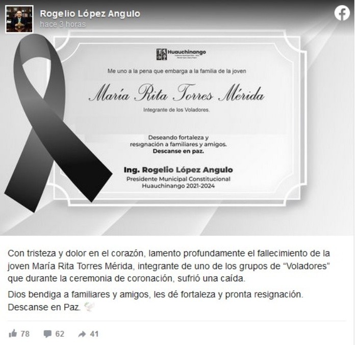 María Rita, de 19 años de edad, formaba parte del elenco que danzaba en las alturas durante la Feria de las Flores de Huauchinango; sin embargo, al momento en que escalaba para realizar su show, la joven cayó de 15 metros de altura y perdió la vida.Los hechos ocurrieron este sábado 4 de marzo cuando en pleno espectáculo de los Voladores de Papantla, el acto de la joven terminó en una tragedia.En el evento se nombró quién sería la reina de la Feria, y al terminar la coronación el alcalde Rogelio López Angulo se enteró de lo acontecido y decidió suspender las actividades restantes de la fiesta.El secretario de Gobernación, Julio Huerta, quien acudió a la ceremonia inaugural, lamentó el accidente y aseguró que tanto el gobierno estatal como las autoridades del Ayuntamiento darán acompañamiento a los familiares de María Rita.JM