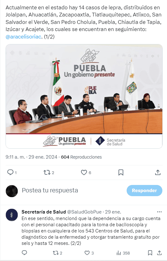 La secretaria de Salud de Puebla, Araceli Soria Córdoba, dijo ayer en conferencia de prensa que en el estado se han detectado 14 casos de lepra en los últimos 5 años, una enfermedad de la piel que provoca lesiones y daños en los nervios.La titular de la dependencia señaló que estos casos acumulados se han presentado en los municipios de Jolalpan, Ahuacatlán, Zacapoaxtla, Tlatlauquitepec, Atlixco, San Salvador el Verde, San Pedro Cholula, Puebla, Chiautla de Tapia, Izúcar de Matamoros y Acajete.Se resaltó que el gobierno de Sergio Salomón realiza acciones de prevención en el estado contra la enfermedad, como toma de baciloscopia en cualquiera de los 543 centros de salud.Se recordó que esta enfermedad es poco contagiosa, y que se transmite por tener un trato continuo y/o prolongado con los enfermos, y que los primeros síntomas son manchas blancas, rojizas o cobrizas en cualquier parte del cuerpo; en las lesiones hay falta de vello y sudoración. En ese sentido, exhortó a las y los poblanos a acudir a su unidad médica más cercana para el diagnóstico oportuno.Soria Córdoba también puntualizó que la Secretaría de Salud estatal cuenta con personal capacitado para la toma de baciloscopia y biopsias para diagnosticar la enfermedad y otorgar tratamiento gratuito por seis o 12 meses, según sea el caso.*Mantente al día con las noticias, únete a nuestro canal de WhatsApp OF