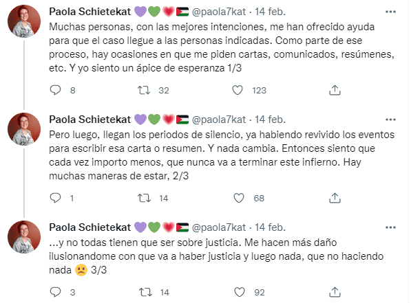 Paola Schietekat pasó de víctima a culpable en un segundo. La mexicana vivía su sueño mientras trabajaba en el Comité Organizador del Mundial de Futbol en Qatar, cuando fue abusada sexualmente, pero en lugar de castigar al agresor, ahora es Paola quien enfrenta una condena de siete años de cárcel y 100 latigazos. Paola contó en redes sociales que la agresión ocurrió la noche del 6 de junio del 2021, cuando un amigo y miembro de la comunidad latina en Doha se metió a su vivienda sin permiso y abusó de ella. Para evitar olvidar cualquier detalle, Paola tomó fotografías de los golpes que recibió en varias partes de su cuerpo, y con eso fue ante las autoridades y con el cónsul de México en Qatar para interponer una denuncia. Poco sabía que comenzaría un nuevo calvario. “Horas después, me salieron moretones en todo el brazo izquierdo, el hombro y la espalda. Mantuve la cabeza fría: le avisé a mi mamá, a un colega del trabajo y documenté todo con fotos, para que mi memoria, en un intento de autoprotección, no minimizara los eventos o borrara por completo parte de ellos. Y denuncié”.Una vez realizada la denuncia, Schietekat fue citada nuevamente ante las autoridades donde tenía que enfrentarse a su agresor, mismo que aseguró que él y Paola eran novios y que la relación sexual fue consensual. El testimonio del supuesto agresor fue suficiente para que Paola pasara de víctima a culpable, pues en Qatar las relaciones extramatrimoniales son un delito, llamado como Zina. “Todo se centró alrededor de la relación extramarital, mientras que, bajo mi abaya, la túnica que me recomendaron usar para parecer una “mujer de buena moral” seguían las marcas, moradas, casi negras. Mi abogada casi no habló. Al final, tuve que entregar mi teléfono, desbloqueado, a las autoridades, si no quería ir presa”, contó Paola en un artículo.Y por si fuera poco, su abogada y el representante legal de su agresor le sugirieron que para evitar ser condenada se casara con él. Afortunadamente, Paola logró salir de Qatar, gracias a la ayuda de Human Rights Watch y el mismo Comité Organizador del Mundial, y volver a México, lugar en el que se encontraba cuando se enteró que fue sentenciada a siete años de prisión y cien latigazos, mientras que su agresor había sido absuelto. Schietekat ha denunciado que en ningún momento fue apoyada por parte de las autoridades mexicanas en Qatar, y sólo recibió ayuda de periodistas que han buscado viralizar su caso.GC