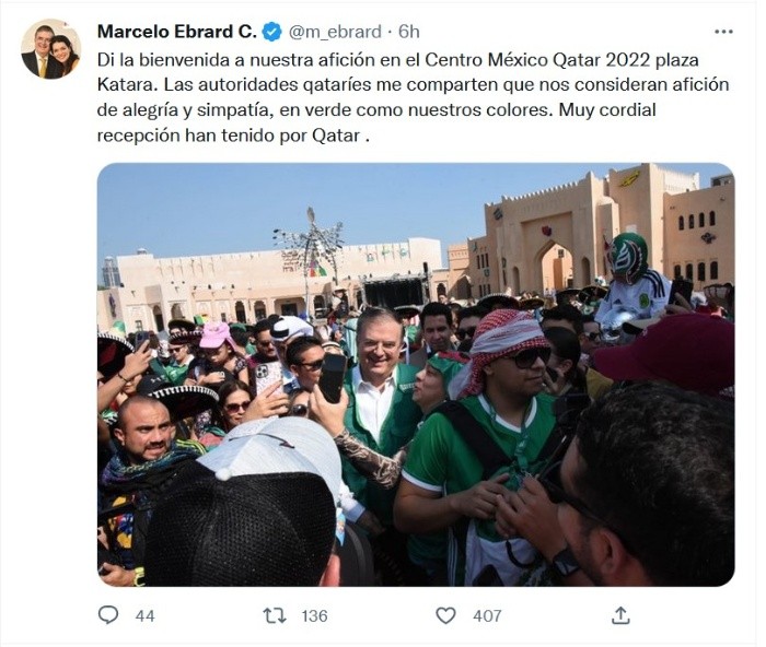 El secretario de Relaciones Exteriores, Marcelo Ebrard, recibió diversas propuestas de apoyo en caso de que sea candidato a las próximas elecciones presidenciales.En el marco de la develación de obras de artistas mexicanos en pleno centro de Doha, los aficionados nacionales que se acercaron al canciller le prometieron su voto… si les daba un poco de alcohol, de ese que es tan codiciado en la Copa del Mundo.Toda una fiesta se vivió en el evento, donde se hicieron presentes diversos grupos de animación, aficionados que hacen el gasto para acompañar a la Selección Mexicana a todos lados y que ahora enmarcan también eventos de tinte político.Entre canciones con mariachi, gritos de júbilo y porras para la Selección, no faltó quien comenzara a expresarse a todo pulmón: "Secretario, saque las chelas". Otro pidió rítmicamente: "Tequila, tequila".Algunos otros fueron más tradicionales y solicitaron pulque. Ante todo esto, el canciller sólo esbozó una sonrisa, que se acentuó cuando alguien gritó: "Unas chelas y tienes mi voto".Marcelo Ebrard ha pedido que la afición mexicana se comporte, que no rompan las reglas establecidas por el gobierno qatarí en cuestión de orden y cero consumo de alcohol en las calles.JM