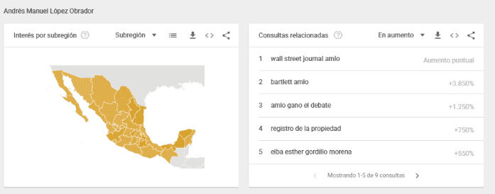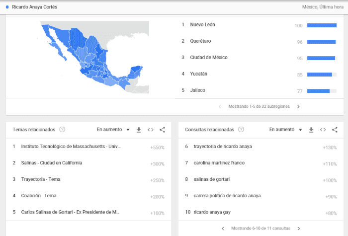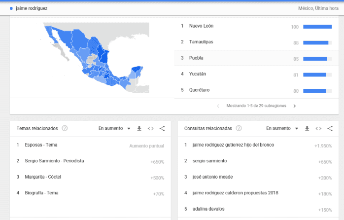 El primer encuentro entre los aspirantes a la presidencia se llevó a cabo la noche de este domingo. Andrés Manuel López Obrador, Ricardo Anaya, José Antonio Meade, Jaime Rodríguez “El Bronco” y Margarita Zavala se enfrentaron en el Palacio de Minería en donde los candidatos hablaron sobre tres rubros: Seguridad Pública y Violencia, Combate a la corrupción e Impunidad, Democracia y Pluralismo.La redacción de EL INFORMADOR hizo una investigación sobre lo más buscado y lo que la gente preguntó más a Google durante el debate.Cuando Ricardo Anaya y José Antonio Meade dijeron que López Obrador proponía una amnistía a los criminales, en Google aumentaron las búsquedas relacionadas con este tema, particularmente las preguntas fueron: amnistía RAE, como respuesta a la frase de Andrés Manuel "amnistía no significa que vamos a perdonar a los criminales".Otro término de los más buscados fue "Barlett Amlo" , inmediatamente después de terminar el debate, luego de que Ricardo Anaya dijera que había metido a varios de la "mafia del poder" a su estructura política, incluyendo a Manuel Barlett. Elba Esther Gordillo también fue tema de interés en el buscador.En menor medida también mostraron interés en los números que dejó López Obrador como jefe de gobierno.Uno de los personajes más buscados y más populares durante el debate fue "El Bronco" quién, desde el primer momento fue tendencia en las búsquedas con términos como: "El hijo del Bronco", luego de que mostró una bala en su primera aparición en el debate y dijera que su mayor motivación para terminar con la inseguridad es que sufrió la pérdida de su hijo a manos de la delincuencia."Yo pude ser uno de esos muertos. Meade ¿te han secuestrado a una hija de dos años?, Anaya ¿alguna vez has sufrido tres atentado por luchar contra la inseguridad de este país?, también usted Margarita. Andrés ¿alguien te ha matado a un hijo? Tengo la experiencia por ser una víctima de este país y de los malos gobiernos", comenzó el debate Jaime Rodríguez.El término "esposas" despuntó cuando dijo que el creía tanto en el matrimonio que se ha casado en tres ocasiones. "Mano" es otra de las búsquedas relacionadas con el "Bronco" gracias a que dijo que, de manera literal, propone "mocharle" la mano a quienes roben.Por su parte, el candidato del PRI, José Antonio Meade Kuribreña apareció en búsquedas relacionadas con su currículum y su gente cercana. Entre los nombres más populares en Google fueron: "Enrique Peña Nieto", "cuál sería el gabinete de Meade" y también buscaron a "El Bronco" y su relación con el candidato. En tema de imagen, la gente cuestionó cuál es la estatura de Meade.El nombre de Carlos Salinas de Gortari, salió como tendencia ligado al nombre del candidato "Por México Al Frente". El término aumentó luego de que Anaya dijera que López Obrador ya le había ofrecido perdón a él, al igual que a Peña Nieto.También se relacionó el término "libro AMLO" cuando el candidato dijo que en el libro que escribió "Fobaproa, expediente abierto", menciona como responsables a varios integrantes de su equipo.Entre otras búsquedas que resaltaron fueron: ¿Cuántos idiomas habla Ricardo Anaya? y ¿Cuánto mide Ricardo Anaya".Margarita Zavala, la candidata independiente, levantó dudas en los ciudadanos que siguieron el debate. En su caso, los términos más buscaron fueron: ¿Quién es el esposo de Margarita Zavala? en Google Trends se puede ver el aumento en esta búsqueda cuando el "Bronco" le dijo que debería dejar de defender a su marido y comportarse como una candidata independiente.Además, el término "casa de Margarita" saltó pues, Zavala dijo que ella no había sido afectada por el poder ya que seguía viviendo en su misma casa. La edad de la candidata también fue una de las dudas de los electores que decidieron utilizar el servicio del buscador.JB.