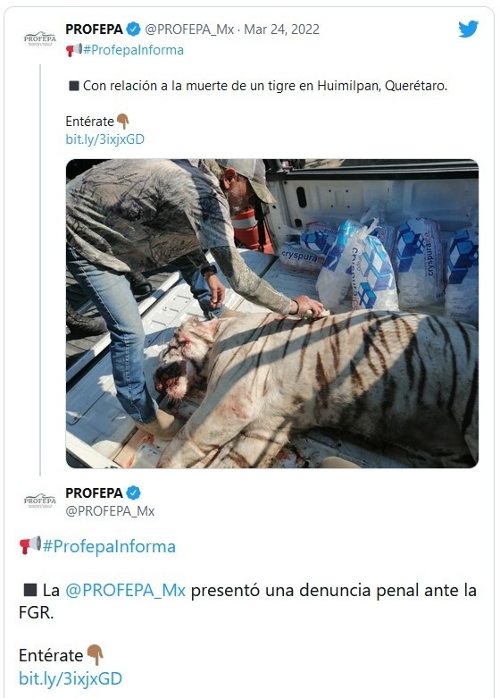 Elementos de la Policía Municipal de Huimilpan, quienes descubrieron la presencia un tigre en la comunidad de La Peña, dispararon contra el felino, el cual perdió la vida de manera instantánea antes de que llegaran los rescatistas de Protección Civil Estatal.Esto fue confirmado por el coordinador estatal de Protección Civil, Carlos Rodríguez Di Bella, quien explicó que el accionar de los uniformados se dio porque el felino tras verse acorralado y nervioso, los atacó.La explicación del funcionario se debió a que en redes sociales corrió la versión de que el tigre estaba muerto, pues en la madrugada de este domingo la dependencia únicamente dijo que había "neutralizado en Huimilpan a un felino de gran tamaño".El escueto comunicado no relataba cómo había ocurrido la muerte del animal, sino únicamente que "representaba un riesgo inminente para la ciudadanía de aquella zona, pues se recibieron reportes en las últimas horas de ataques a animales de granja, por lo que, de manera conjunta autoridades estatales y municipales tomaron la determinación de actuar para salvaguardar la seguridad de los ciudadanos".Asimismo, el comunicado decía que se dio aviso a la Unidad de Control Animal del municipio de El Marqués, misma que apoyó en la atención, el traslado y la realización de las pruebas correspondientes al felino, para saber si es el mismo que buscaban en Apaseo El Grande, Guanajuato.La Policía Municipal de Huimilpan recibió críticas luego de que matara a un tigre que fue capturado tras un operativo. De acuerdo con Teresa Roldán, defensora de los derechos ambientales, esta medida pudo haberse evitado si las autoridades de Protección Civil hubieran preparado e implementado los protocolos de coordinación pertinentes."Protección Civil y la delegación de la Procuraduría Federal de Protección al Ambiente (Profepa) afirmaron que se trató de un animal que se tornó violento al momento de que se trató de rescatarlo, a lo cual se sumó que había personas en el punto en el cual se encontraba, por lo cual se procedió a dispararle", dijo Teresa Roldán.Roldán indicó que era evidente que el animal tendría alguna reacción en cuanto algunas personas trataran de capturarlo, pero que tuviera miedo es muy diferente a decir que se trató de un animal agresivo; de igual manera, añadió que al ejecutarlo la justificación de las autoridades ofende a la ciudadanía."Si está teniendo humanos, de alguna forma, agrediéndolo, sintiéndose amenazado, ¿quién les dice que el tigre no estaba atemorizado? Era un animal salvaje y tenía que haber reacción ante la presión que estaba sintiendo. Señaló que las unidades municipales de Protección Civil de Corregidora, Huimilpan, así como las de los municipios colindantes de Guanajuato debieron de coordinarse para tener un resultado diferente en el que se cuidará de la vida del ejemplar felino.Explicó que el 22 de marzo ingresó un documento para que el Gobierno estatal dé a conocer qué ocurrió, las acciones de las instancias que debieron actuar, así como aquellas medidas que debieron implementarse en el caso del tigre. La activista señaló que, en caso de no tener respuesta, se analizarán las opciones a recurrir, además de que se tomará el asesoramiento que ofreció la Universidad Autónoma de Querétaro (UAQ).