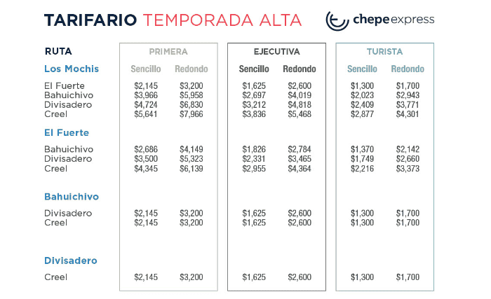 En México también hay nieve. Diversos lugares en nuestra amplia geografía se cubren de nieve en paisajes idílicos e irrepetibles donde se conjugan toda clase de ecosistemas, culturas y naturalezas contrarias. En las profundidades de la Sierra Tarahumara del norte de México, durante el invierno, sus cañones y valles hacen metamorfosis de días blancos, horizontes límpidos y tardes de copos de nieve, pinos escarchados, fantasías nórdicas y madrugadas frías. México está atravesado de sierras. De montañas, cañones, barrancas, picos nevados, serranías desérticas, inmensidades pobladas de silencio y de nubes. En el norte de nuestro país, en la Sierra Tarahumara, se encuentra la Barranca del Cobre, rojiza y sin límites, y 4 veces más grande que el Gran Cañón de los Estados Unidos. Uno de los recorridos turísticos más inigualables que ofrece nuestro país es el del Chepe Express: un tren que serpentea a través de los cañones, las barrancas y las sierras, y que se detiene en estaciones determinantes de divisaderos, pueblos y comunidades que no tienen otro propósito de existir más que el de empequeñecer la imaginación. Una inmersión profunda en el norte montañoso de México.El Chepe tiene una extensión de más de 350 kilómetros, que recorre en un andar parsimonioso de casi diez horas. Tiene salidas diarias, desde las ocho de la mañana, siendo la última a las 5:40 de la tarde, cuando la oscuridad cae más temprano ante la vigilia silenciosa de los tarahumaras. En el tránsito de sus vías, desde sus ventanales grandes, se divisa lo eterno, los barrancos sin término que el hombre común no podrá recorrer más que con la contemplación, los túneles que el hombre horadó en la roca, el atardecer escurriendo por los cañones, planicies desérticas donde se conjugan la aridez y el cántico de río. El Chepe Express tiene cinco estaciones, en dos estados de la República:El Chepe no es un paseo económico como tal, pero no cabe duda que vale la pena por adentrarse en uno de los lugares más difíciles de México. Los precios varian por diversos factores. Si el viaje es sencillo o redondo, si es temporada alta o baja, y si se viaja en primera clase, clase ejecutiva, o clase turista, que es la más económica.Además, el precio también varía dependiendo de la estación a la que se desee llegar. Para la clase turista -la más asequible-, el viaje redondo desde Los Mochis hasta Creel sería de $4301 pesos por persona, mientras que en primera clase sería de $7966 pesos por persona. En la página oficial del Chepe Express pueden consultarse los precios actuales, además de paquetes existentes. Hay que considerar que estamos por entrar en el tarifario de la temporada alta. La temporada alta para 2023 es del 2 al 16 de abril, del 2 de julio al 31 de agosto, y del 18 de diciembre al 10 de enero del 2024. También hay que tener en cuenta que para quienes no viven en Chihuahua o Sinaloa, también hay que tener en mente en el costo del viaje los boletos de transporte, hospedaje y alimentación para llegar a El Chepe. FS