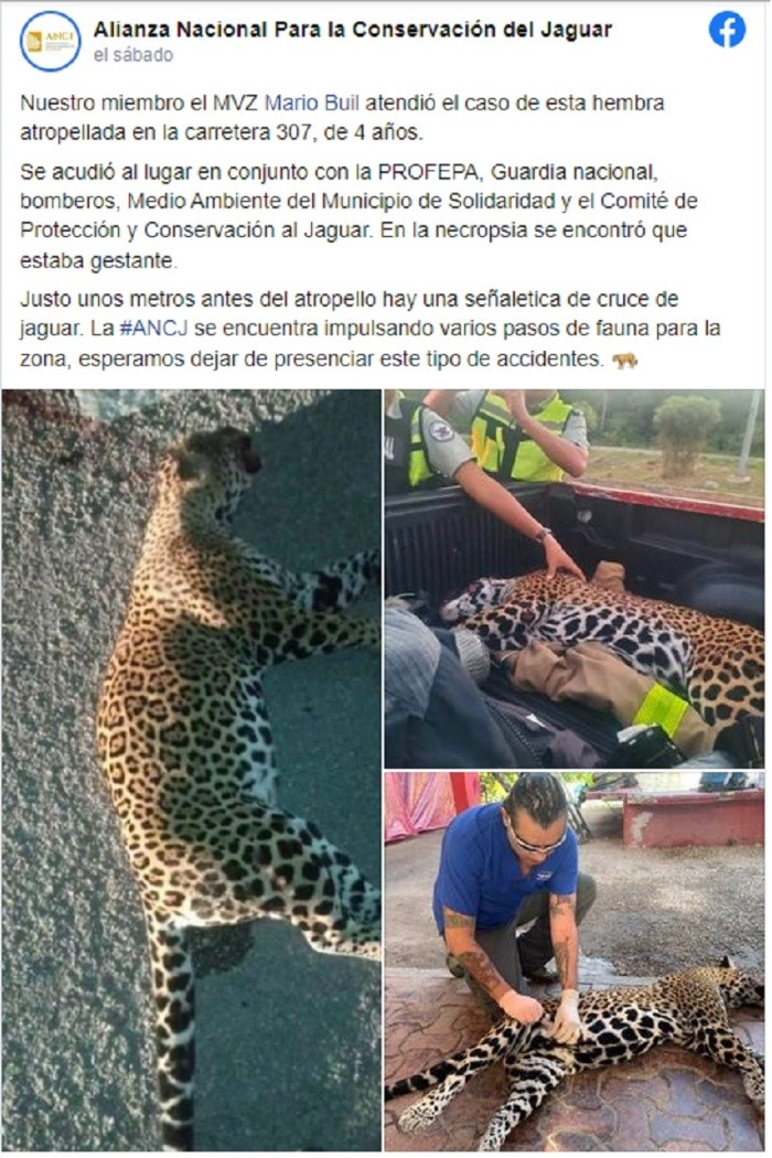 Un integrante de la Alianza Nacional para la Conservación del Jaguar atendió a un ejemplar de jaguar, el cual fue atropellado en la carretera 307, dirección Cancún-Playa del Carmen, cerca de un recinto turístico.El pasado 2 de febrero Mario Buil, por medio de su cuenta de Facebook, informó sobre el fallecimiento de "Naku", un jaguar hembra, la cual se encontraba a días de dar a luz, y que fue arrollada antes de una señalética de cruce o paso de Jaguar.El lugar de los hechos ocurrió entre playa del secreto y el hotel Nickelodeon, presuntamente el ejemplar se encontraba cruzando la carretera para que su cachorra naciera al otro lado.El trabajo de rescate fue atendido junto con la Procuraduría Federal de Protección al Ambiente (Profepa), Guardia Nacional, Bomberos, Medio Ambiente del Municipio de Solidaridad y el Comité de Protección y Conservación al Jaguar.En su publicación, Mario informó sobre la importancia de respetar las señalizaciones de tránsito en el lugar, debido a que fueron colocadas tras un estudio científico y toma de datos desde hace 10 años."No están ahí por adorno o por qué se ven bonitas, ni tampoco son promocionales de parques turísticos, como mucha gente piensa, las pusimos ahí con base en un estudio científico y toma de datos realizados desde hace ya más de 10 años, si las ves baja la velocidad, por qué de eso depende la vida de varias especies de Fauna Silvestre y también la de las personas que van en ese vehículo", escribió.MF