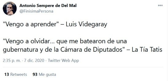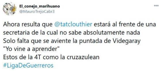 Tatiana Clouthier fue designada por el Presidente Andrés Manuel López Obrador (AMLO) como titular de la Secretaría de Economía y en ese contexto, se volvió tendencia en redes sociales la frase "vengo a aprender", que Luis Videgaray dijo en 2017 cuando fue nombrado titular de la Secretaría de Relaciones Exteriores.Tras el anuncio esta mañana, en redes sociales cuestionaron la poca experiencia de Clouthier en materia económica y la compararon con Videgaray, quien al ser nombrado titular de la SRE en el Gobierno de Enrique Peña Nieto, reconoció que no tenía conocimiento de la cancillería ni experiencia diplomática."Yo no conozco la Secretaría de Relaciones Exteriores más que como se puede conocer desde fuera. No soy diplomático, nunca he tenido más allá de los encargos propios de la Secretaría de Hacienda en la representación de nuestro país. Ustedes han dedicado su vida entera a ello. Se los digo de corazón y con humildad: vengo a aprender de ustedes, vengo a hacer equipo con ustedes en un momento en que México no necesita a todos más que nunca", mencionó entonces.Clouthier fue coordinadora de campaña de López Obrador y actualmente es diputada federal por Morena. De acuerdo con el Sistema de Información Legislativa (SIL), tiene una licenciatura en Lengua Inglesa por el Instituto Tecnológico de Estudios Superiores de Monterrey (ITESM) y una maestría en Administración Pública por la Universidad Autónoma de Nuevo León. IM