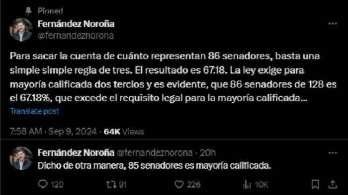 Tras ignorar la contrapropuesta de reforma judicial de Norma Piña, presidenta de la Suprema Corte de Justicia de la Nación, Morena y aliados seguirán adelante con el dictamen avalado el pasado domingo en comisiones y que hoy se discutirá en el Senado. Además, la aplanadora oficialista quiere hacer valer su mayoría “a como dé lugar”. El presidente del Senado, Gerardo Fernández Noroña, insistió en que son 85 y no 86 los senadores que necesitan para alcanzar la mayoría calificada. “Basta una simple regla de tres. La ley exige para mayoría calificada dos tercios y, es evidente, que 86 senadores de 128 es el 67.18%, lo que excede el requisito legal para la mayoría calificada. Dicho de otra manera, 85 senadores son mayoría calificada”, afirmó. Este argumento está en franca contradicción con lo expresado en la Constitución mexicana en su Artículo 96 y la Ley Orgánica del Congreso, entre otras normativas oficiales, que indican que la mayoría calificada corresponde a las dos terceras partes, cuando menos, de los legisladores que se encuentren presentes para votar en el pleno. Es decir, si votan 128 senadores, la mayoría calificada es 86. “La Constitución es muy clara cuando habla de dos terceras partes de los presentes para las reformas constitucionales. No se puede fraccionar una persona o una representación política”, explicó Marcos del Rosario Rodríguez, académico del ITESO. A pesar de este desafío a las normas vigentes, Morena sigue adelante con la iniciativa, sin escuchar los argumentos contrarios. Así lo manifestó Patricia Aguayo, vocera de los trabajadores del Poder Judicial, que se mantienen en paro y quien denunció que Noroña les tendió una “trampa mediática” al afirmar, en reunión privada, que no le moverán una sola coma a la minuta. Por eso Morena quiere adelantar la votación de la iniciativa del Plan C en una doble sesión legislativa. El senador Manuel Velasco, coordinador de la bancada del Partido Verde en la Cámara Alta, adelantó que la pretensión del bloque oficialista es votar la reforma a más tardar hoy o en las primeras horas de mañana. Mientras tanto, la contrapropuesta a la reforma judicial anunciada por Norma Piña, la cual incluye 66 iniciativas con las visiones de la Judicatura, la academia, estudiantes y organismos civiles, ha sido bateada por legisladores morenistas y algunos colegas de la Suprema Corte de Justicia. “Me parece absolutamente incomprensible ese manejo de los tiempos y una falta de respeto al pueblo de México”, declaró Óscar Cantón, secretario de la Comisión de Puntos Constitucionales del Senado. “Resulta inoportuno y poco serio”, señaló la ministra Lenia Batres. La presidenta electa de México, Claudia Sheinbaum, catalogó como “escandaloso” que Norma Piña reconociera, en su contrapropuesta, que 30% de los trabajadores del Poder Judicial tienen familiares trabajando ahí mismo, por lo que cuestionó el nepotismo. “La manera de entrar al Poder Judicial es por relaciones familiares y no por la carrera judicial que defienden tanto”.La Corte acordó ayer mantener la suspensión de actividades que empezaron el 3 de septiembre, uniéndose así a los trabajadores del Poder Judicial, que suman casi tres semanas en paro contra la reforma judicial. El temor de que el senador del PAN, Miguel Ángel Yunes Márquez, sea el voto 86 que necesita Morena y aliados para sacar adelante la reforma judicial sin problemas, se acrecentó ayer luego de que el legislador veracruzano no se presentó a la reunión de la bancada del partido, alimentando los rumores de un posible “cambio de bando”“Le demando, con respeto, pero con absoluta firmeza, que se pronuncie públicamente en contra de la reforma judicial y que cumpla su palabra ante la sociedad”, declaró Guadalupe Murguía, coordinadora de los senadores del PAN“Lo exhortamos a que públicamente se manifieste y refrende su compromiso con los principios éticos y con el interés superior de la República, que protestó guardar ante el pleno de la Cámara Alta”, afirmó la Asociación Nacional de Magistrados de Circuito y Jueces de Distrito del Poder Judicial de la Federación (Jufed), quien advirtió al senador que, de votar a favor de la reforma judicial de Morena, “sería el periodo más negro que viva nuestra democracia”.LA VOZ DE LOS EXPERTOSHéctor Ruíz López, investigadores del CUCSH UdeG.Héctor Ruíz López, profesor investigador del Centro Universitario de Ciencias Sociales y Humanidades de la Universidad de Guadalajara, comentó que el senador Fernández Noroña no conoce bien los estatutos y requerimientos legales del propio Congreso para lograr la mayoría calificada.“Yo digo que está mal informado el senador y presidente del Senado ya que, incluso, la página que se llama Sistema de Información Legislativa, que es una página del Congreso de la Unión, establece o define qué se debe de entender por mayoría calificada. En este link se dice clara y perfectamente que, en el caso de la Cámara de Senadores, se requerirán 86 votos de los 128 para lograr lo que conocemos como mayoría calificada”, mencionó.Además, destacó que la Suprema Corte de Justicia de la Nación, a través de un principio de “redondeo”, ha definido y establecido que siempre que ocurra una fracción en la votación se ajusta al número entero superior, no inferior.“En esta caso dos terceras partes de 128 legisladores son 85.33, entonces, de acuerdo a los criterios que ha manejado la Corte, y a lo que se ha venido acostumbrado históricamente desde que el Poder Legislativo en la Cámara de Senadores tiene 128 integrantes, pues siempre la mayoría calificada ha sido 86 senadores”.Por su parte, lamentó que la contrarreforma propuesta por la ministra Norma Piña haya llegado tan tarde pese a todos los foros de discusión. “No entiendo el porqué la Suprema Corte la presenta tan tarde, si me perdonas la expresión, al cuarto para las