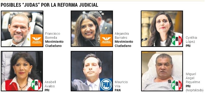 Seis nombres están sonando en el Senado de la República como posibles votos desde la oposición a favor de la reforma judicial, lo que permitiría a Morena y sus aliados obtener la mayoría calificada en la Cámara y modificar la Constitución. Esto se debe a que los senadores del PRD, Araceli Salcedo y José Sabino, se unieron a la bancada de Morena, acercando a esta última a un sólo voto de la supermayoría (86 senadores). Entre las sospechas, se encuentran integrantes del PRI y Movimiento Ciudadano.Marcos Rosario Rodríguez, director del Departamento de Estudios Políticos y Jurídicos del ITESO, expresó que la reforma pasará. Aunque no lo considera traidor, sugiere que algunos senadores del PRI podrían ser afines a la reforma debido a sus tendencias.Uno de los senadores en el foco de atención es Francisco Barreda, de Movimiento Ciudadano, quien no ha definido su postura respecto a la reforma. Su compañera en el partido naranja, Alejandra Barrales, ya se ha pronunciado en contra de la reforma.También se menciona a Cynthia López, senadora del PRI, quien se tomó varias fotografías con la secretaria de Gobernación, Luisa María Alcalde. Sin embargo, López compartió un video en redes sociales en el que descartaba unirse al voto a favor de la reforma judicial.Además, se habla de Anabell Ávalos y Claudia Anaya, ambas legisladoras que también han manifestado que votarán en contra de la reforma.Los expertos también han señalado a Mauricio Vila, exgobernador panista de Yucatán, con quien el Presidente López Obrador ha alcanzado acuerdos, especialmente en materia de infraestructura. Sin embargo, Vila también ha llamado a votar en contra de la reforma.Existe otra opción: que Morena aproveche la ausencia del senador priista y exgobernador de Coahuila, Miguel Ángel Riquelme, quien informó que está hospitalizado. Dado que no puede votar a distancia, podría solicitar una licencia y llamar a su suplente, facilitando así el voto a favor de Morena.Por otra parte, luego que la minuta para discutir la reforma judicial llegó a la Cámara Alta (Senado), el presidente del Senado, Adán Augusto López Hernández dijo que la mayoría calificada podría ser alcanzada sólo con 85 votos, y no con 86 como ha sido siempre, por lo que le aseguraron que no podrá “redondear” el número.