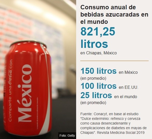 "¿Para qué necesitamos el veneno embotellado, el de los refrescos?"Con esta comparación, el subsecretario de Salud mexicano, Hugo López-Gatell, volvió a poner hace unos días sobre la mesa una realidad visible en casi cada hogar y tienda del país: México es el lugar donde más bebidas azucaradas se consumen en todo el mundo.El impacto en la población es alto. Según un estudio del Instituto Nacional de Salud Pública, cada año más de 40.000 muertes en el país (un 7% del total) "son atribuibles" al consumo de estas bebidas por aumentar el riesgo de enfermedades crónicas, dijo el subsecretario.Pero este ya conocido y extendido hábito alimenticio de los mexicanos despertó aún más preocupación en tiempos de pandemia del coronavirus, ya que la mayoría de los más de 50.000 fallecidos tenía diabetes, hipertensión u obesidad (o varias de ellas)."México es el país que sufre la mayor mortalidad en adultos jóvenes por covid-19 porque afecta a personas con este tipo de enfermedades crónicas (…) que se las ha causado este modelo de alimentación que predomina en México desde hace más de 30 años", dijo López-Gatell."Es lo que se llama la comida chatarra, incluidas las bebidas azucaradas, que son verdaderamente generadores de esta epidemia en una gran proporción", agregó.La Asociación Nacional de Productores de Refrescos y Aguas Carbonatadas (ANPRAC) criticó que se quiera estigmatizar estas bebidas para buscar "un culpable único a un problema de salud de origen multifactorial"."De acuerdo con la FAO, solo el 5,8% de calorías que consumen diariamente los mexicanos provienen de bebidas saborizadas, y más del 70% vienen de alimentos y bebidas no industrializadas, por lo que resulta ilógico pretender responsabilizar a estos productos del 7% de muertes", aseguró en un comunicado.Pese a todo, las autoridades de México -donde la diabetes es la segunda causa de muerte y que tiene la segunda mayor tasa de obesidad del mundo- están tomando medidas para reducir la ingesta de estos productos.Al impuesto que se gravó a sus precios en 2014 y al nuevo etiquetado que alertará desde octubre de los que tienen exceso de calorías, grasas y sal; se sumó hace dos semanas la inédita decisión de Oaxaca de prohibir la venta de refrescos y comida chatarra a menores de edad.Sin embargo, este no es ni de cerca el estado mexicano donde más se toman estas bebidas.Según el Consejo Nacional de Ciencia y Tecnología de México (Conacyt), Chiapas es la región del mundo donde más se bebe Coca-Cola, el refresco favorito de los mexicanos (sus productos representan más del 70% del consumo nacional de bebidas azucaradas embotelladas, según la organización El Poder del Consumidor).El Conacyt se basa en un estudio que muestra cifras impactantes, como que el consumo medio por persona en este estado del sur de México es cinco veces superior al del resto del país y 32 veces más que el promedio mundial."Es el epicentro de la epidemia de consumo de refrescos", le dice a BBC Mundo el doctor Marcos Arana, investigador del Instituto Nacional de Ciencias Médicas y de la Nutrición Salvador Zubirán.BBC Mundo preguntó a la ANPRAC por las cifras de este estudio y otras cuestiones, pero no obtuvo respuesta antes de la publicación de este artículo.De lo que no hay duda es de que los refrescos forman ya parte esencial de la vida cotidiana en este estado, especialmente en la región de Los Altos de Chiapas, donde la mayoría de su población es indígena y rural.En esta zona, donde Coca-Cola tiene una planta embotelladora en el municipio de San Cristóbal de las Casas, el consumo de esta marca es aplastantemente mayoritario respecto a la competencia ya desde temprana edad de la población."Al 3% de niños menores de seis meses, sus madres les dan Coca-Cola, en un momento que solo deben tomar leche materna,", destaca Arana entre las conclusiones más destacadas de una investigación en la que participó en 2016.Organizaciones locales como el Centro de Capacitación en Ecología y Salud para Campesinos (CCESC) que Arana dirige apuntan como causas de este consumo desmedido a las "agresivas" prácticas comerciales de las refresqueras y a la fácil accesibilidad de sus productos en la zona."Coca-Cola es el producto más disponible en Los Altos, uno tiene que caminar más distancia para comprar tortillas o cualquier otra cosa. La cantidad de puntos de venta es excesiva, sin ningún control, y con precios reducidos hasta el 30%", dice Arana."La disponibilidad y publicidad de algo tan barato es tan grande y omnipresente en Chiapas ante poblaciones vulnerables que han creado una adicción que se ve como necesidad", afirma."Pobladores me decían que antes de que llegara el camino a Tenejapa, allí no había ni diabetes ni problemas cardiovasculares. Que eso empezó cuando llegó la carretera al pueblo y llegaron los refrescos, las papas fritas…", le dice a BBC Mundo Jaime Page Pliego, antropólogo y autor del estudio citado por el Conacyt.El experto asegura que la rutina ahora para los habitantes de esta zona pasa por desayunar café y llevarse "dos o tres litros de Coca-Cola" al campo para tomar en la hora de la comida.Cuando Page, miembro del Centro de Investigaciones Multidisciplinarias sobre Chiapas y la Frontera Sur (CIMSUR-UNAM), pregunta en las comunidades por qué beben tanto refresco, suele escuchar las mismas respuestas: "Porque me gusta, me llena, y lo extraño cuando no lo tomo. No puedo dejar de tomarlo"."Incluso los mismos diabéticos con los que trabajo reconocen que lo siguen tomando, aunque sea menos. No pueden concebir la vida sin refresco. Es verdaderamente una tragedia", afirma.Pero entre las causas de su consumo y valoración también existe un componente religioso, al formar parte de ceremonias tradicionales indígenas.Así, Page refleja en su estudio cómo el pox (un aguardiente de caña) y otras bebidas alcohólicas fueron eliminadas de los rituales para dejar paso a los refrescos