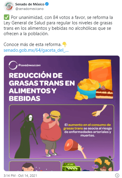 El pleno del Senado de la República aprobó por unanimidad reformas en materia de salud que delimitan el uso de las llamadas grasas trans en la elaboración industrial de alimentos, sobre todo en harinas, galletas, margarinas, frituras, dulces y otros productos, así como en bebidas no alcohólicas, con lo que se busca disminuir la obesidad y las enfermedades cardiovasculares en México.La reforma a la Ley General de Salud que fue turnada a la Cámara de Diputados para su análisis señala que los aceites y grasas comestibles, así como los alimentos y bebidas no alcohólicas, no podrán contener en su presentación para venta al público aceites parcialmente hidrogenados, conocidos como grasas trans, que hayan sido añadidos durante su proceso de elaboración industrial.Se determina que los alimentos, bebidas no alcohólicas, aceites y grasas no podrán exceder dos partes de ácidos grasos trans de producción industrial por cada cien partes del total de ácidos grasos.La senadora por Morena, Lilia Margarita Valdez, promotora de la reforma, expuso la importancia de la misma porque actualmente en México se utilizan las llamadas grasas trans en la margarinas, frituras, comidas y dulces, afectando la alimentación de millones de mexicanos sobre todo con altos índices de enfermedades cardiovasculares.La reforma faculta a la Secretaría de Salud para establecer las bases de regulación para los ácidos grasos trans de producción industrial.Ruy López Ridaura, director general del Centro Nacional de Programas Preventivos y Control de Enfermedades, ha señalado que los ácidos grasos trans de producción industrial (AGT-PI) se han definido como sustancias tóxicas y como tales deben eliminarse del consumo humano.Expuso que la política de la Secretaría de Salud se enfoca a controlar el riesgo cardiovascular en tres niveles de atención, dijo que si se eliminan del consumo humano, podría prevenirse entre el 5% y el 10% de muertes cardiovasculares en el país.Juan Núñez, coordinador de la Coalición México SaludHable, señaló que esta iniciativa terminaría con cien años de uso de grasas trans y aceites parcialmente hidrogenados que solo benefician a quienes fabrican alimentos con esos componentes, pero que dañan a quienes los consumen.La activista de Salud Justa Mx, Yahaira Ochoa, expuso que 58 países restringen las grasas trans, por lo cual este año protegerán la salud de 3 mil 200 millones de personas.Desafortunadamente, 15 países que representan el 75% de muertes por consumo de grasas trans no han implementado políticas públicas que limiten o prohíban esos componentes.AF