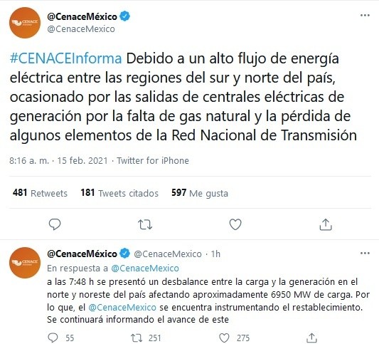 La mañana de este lunes se registró un apagón que afectó a algunas zonas como Monterrey, capital de Nuevo León, Chihuahua, Tamaulipas y Coahuila, justo donde se registran temperaturas congelantes e incluso nevadas.De acuerdo con información del Centro Nacional de Control de Energía (Cenace) difundida a través de redes sociales, debido a un alto flujo de energía eléctrica entre las regiones del sur y norte del país, ocasionado por las salidas de centrales eléctricas de generación por la falta de gas natural y la pérdida de algunos elementos de la Red Nacional de Transmisión, a las 7:48 horas de este lunes se presentó un desbalance entre la carga y la generación en el norte y noreste del país afectando aproximadamente seis mi 950 MW de carga.El Cenace afirmó que trabajan en el restablecimiento del servicio, porque además de que tiene relación con la falta de gas natural hay pérdida de algunos elementos de la Red Nacional de Transmisión.Antes, señaló que debido los efectos del Frente Frío No. 35 y en relación al Estado Operativo de Alerta declarado el pasado sábado 13 de febrero de 2021, así como la falta de suministro de gas natural, el Cenace solicitó a la población en general de los estados del Norte del país (en particular de Nuevo León, Tamaulipas y Chihuahua) su apoyo para reducir el uso y consumo de la energía eléctrica no prioritaria durante las próximas horas "ya que este evento climatológico requiere que se salvaguarde la infraestructura del Sistema Eléctrico Nacional". "Con ayuda de todos sus usuarios para minimizar riesgos de interrupciones o daños mayores. Agradecemos el apoyo de toda la ciudadanía ante esta contingencia. Se continuará informando al respecto".GC