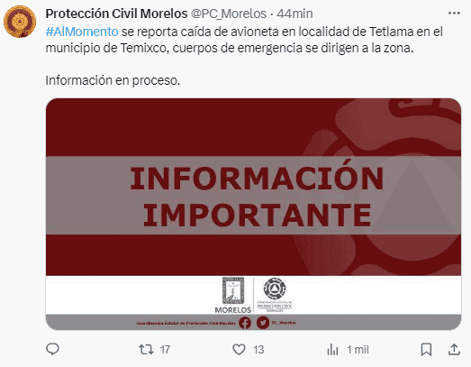 Protección Civil de Morelos reportó la caída de una avioneta en la localidad de Tetlama, ubicada en el municipio de Temixco en Morelos, por lo que los cuerpos de emergencia desplegaron actividades de rescate.Los hechos se dieron a conocer por las autoridades locales por la tarde del miércoles 1 de noviembre, poco antes de las 15:00 horas. A través de su cuenta oficial de "X", Protección Civil de Morelos informó sobre los hechos. Mientas que en una grabación en redes sociales circula un breve video en el que los pobladores hablan sobre la avioneta. Las autoridades de Morelos confirmaron que la aeronave siniestrada fue una ambulancia aérea y perdieron la vida cuatro personas.Carlos Calteneco, secretario general del Gobierno de Temixco, dijo que la avioneta cayó a un costado del aeropuerto local, localizado en la colonia Benito Juárez.La avioneta cayó en las faldas de un cerro, lo que dificultó el acceso de los cuerpos de emergencia a la zona; las autoridades no han revelado el número de la matrícula.El sitio quedó resguardado de agentes de la Secretaría de la Defensa Nacional (Sedena) y la Fiascalía de Morelos, a esperar de que las autoridades de aeronáutica civil realicen los peritajes y diligencias necesarias para determinar las causas del accidente.Mantente al tanto de las noticias, únete a nuestro canal de Whatsapp.MM