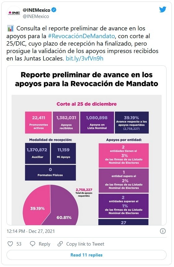 Este lunes, el Instituto Nacional Electoral (INE) informó en un comunicado que las firmas recolectadas con aplicación (APP) para la revocación de mandato suman un millón 382 mil, pero son sólo validas un millón 080 mil, lo que representa un avance de 39% de los apoyos requeridos para llevar a cabo el ejercicio.En una tarjeta informativa, el INE detalló que con corte al 25 de diciembre de 2021, en total el INE recibió un millón 382 mil 031 apoyos, de los cuales un millón 080 mil 898 se verificaron en la lista nominal, lo que representa el 39.19% del avance respecto a los apoyos requeridos; es decir, 301 mil 133 apoyos recibidos presentaron inconsistencias.Recordó que al 25 de diciembre pasado, el INE recibió aproximadamente dos mil 398 cajas con firmas en formatos físicos, las cuales serán cuantificadas y valoradas por la autoridad electoral.Algunas de las irregularidades que el INE reportó en las firmas son:JM