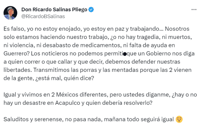 Tras la llegada del huracán Otis como categoría 5 al estado de Guerrero, el papel que ha tenido el gobierno de Andrés Manuel López Obrador para brindar la atención a los damnificados se ha convertido en un choque mediático entre el presidente y Ricardo Salinas Pliego, empresario y dueño de Grupo Salinas.López Obrador ha señalado que el noticiario de TV Azteca se ha encargado de crear "una campaña hablando de la incapacidad del gobierno y abriendo el micrófono para que me mienten la madre los entrevistados".Ante estas declaraciones, Ricardo Salinas alzó la voz y a través de su cuenta de X, y sin mencionar al presidente, expresó que en lugar de culpar a los medios por mostrar la verdad, el gobierno debería ponerse a trabajar.Esta situación generó que durante la conferencia matutina de hoy, el mandatario mencionara que Salinas "está enojado" por el cobro de 25 mil millones de pesos que adeuda a la hacienda pública desde hace ya varios sexenios. Asimismo, reconoció que ambos tienen diferencias y que ha hablado con él respecto al tema de la evasión de impuestos."Él sabe por qué tenemos diferencias; además, yo creo, ya mucha gente lo sabe. Yo he hablado con él y voy a seguir hablando. Él tiene una querella, tiene un proceso legal, porque desde los tiempos de Fox, cuando era secretario de Hacienda, Francisco Gil Díaz, le presentaron una denuncia por evasión de impuestos, no exactamente así, no conozco a detalle el tema, pero le exigen un pago de impuestos; esto se ha litigado sexenio tras sexenio", dijo el presidente.En respuesta, Salinas aseguró que no está enojado y que ellos solo están haciendo su trabajo y que no solo transmiten las "mentadas de madre" sino también las porras y que ambas vienen de la gente.YC