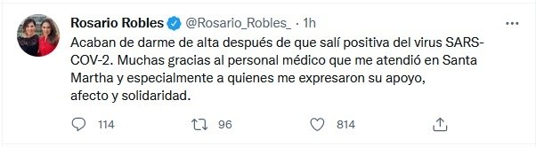 Rosario Robles, exsecretaria de Desarrollo Social (Sedesol) con Enrique Peña Nieto, informó que fue dada de alta luego de haber dado positivo a COVID-19 en el penal de Santa Martha Acatitla.En un mensaje a través de redes sociales, la exfuncionaria compartió su diagnóstico: "Acaban de darme de alta después de que salí positiva del virus SARS-COV-2".Ocho días después de que su hija, Mariana Moguel, diera a conocer que dio positivo al virus, Rosario Robles también agradeció la atención del personal médico del penal de Santa Martha Acatitla, donde se encuentra recluida por su presunta responsabilidad en la llamada "Estafa Maestra".Asimismo, mostró su agradecimiento a quienes le expresaron su apoyo y le mandaron sus buenos deseos.El 18 de enero, cuando se supo del contagio de COVID de Rosario Robles, la hija de la exfuncionaria recordó que en diciembre pasado, el juez de control Ganther Alejando Villar Ceballos le negó continuar su proceso en libertad bajo el argumento de que su salud no estaba en riesgo.Derivado de esto, las autoridades penitenciarias de la Ciudad de México informaron que ante el resultado positivo de Rosario Robles a COVID, la exfuncionaria fue ubicada en un área de observación médica dentro del penal de Santa Martha para que recibiera la atención pertinente durante su recuperación.JM