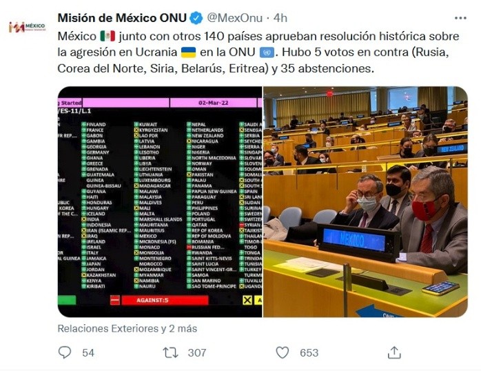 La misión de México en las Naciones Unidas (ONU) calificó como una "resolución histórica" que el país, junto a otras 140 naciones, se hayan pronunciado en contra de la agresión de Rusia a Ucrania.Mediante redes sociales, la diplomacia mexicana encabezada por el embajador Juan Ramón de la Fuente aplaudió la votación en la que sólo cinco países, entre ellos Rusia, se negaron a criticar los ataques iniciados el jueves pasado."México junto con otros 140 países aprueban resolución histórica sobre la agresión en Ucrania en la ONU", celebró la diplomacia."Hubo 5 votos en contra (Rusia, Corea del Norte, Siria, Belarús, Eritrea) y 35 abstenciones", continuó.México, como adelantó De la Fuente el martes, votó a favor.Desde Nueva York, el embajador explicó que esto se debió a que el documento "contiene muchos de los argumentos que hemos esgrimido en diversos foros en relación al tema e incluye además una cláusula que hemos propuesto para dejar abierta la puerta de la diplomacia por donde tendrá que venir finalmente la solución al conflicto".Durante la última de las asambleas generales de emergencia que fueron convocadas en la ONU, embajadores y enviados diplomáticos de 141 países recibieron con ovaciones la petición de alto al fuego ruso.La resolución, de 16 puntos, "condena en los términos más enérgicos la agresión cometida por la Federación de Rusia contra Ucrania".También "exige que la Federación de Rusia ponga fin de inmediato al uso de la fuerza contra Ucrania".Condena a la vez "todas las violaciones del derecho internacional humanitario y las violaciones y los abusos de los derechos humanos".JM